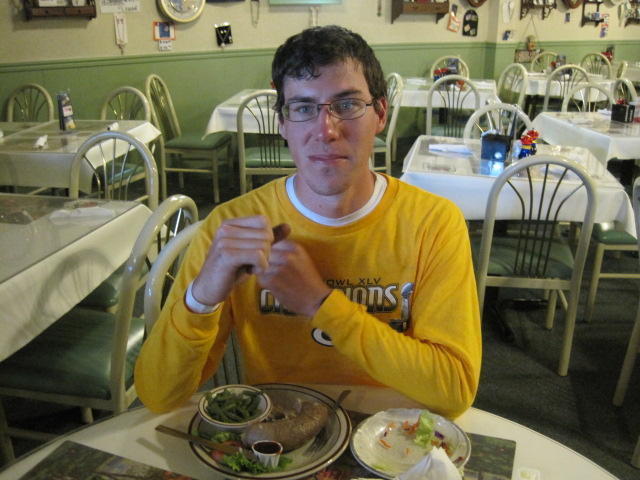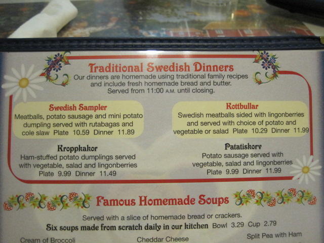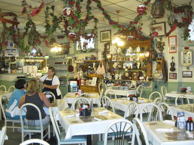 We pedalled 12 blocks off route to find the Swedish Pantry, a restaurant that had proclaimed itself the best in town on several billboards. The place occupies a colourfully decorated building and inside the decorations are over the top. The main elements seem to be clocks and dolls. It's a frilly environment whose Swedish authenticity we are not qualified to judge. The food too seemed Swedish, in an Ikea sort of way. We had the roast pork and the pot roast of beef. Though drowned in gravy it was quite edible.