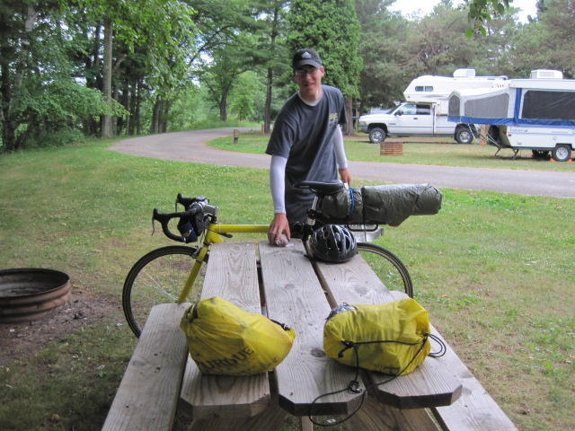 We did not get up particularly early, whether by Eastern Time or Central Time. The mosquitoes in any event had beat us to it, and our pack up was correspondingly hurried. We got in a brief further chat with Tim and had a quick look at his gear, or lack of it. Tim's version of a sleeping bag is a small blanket and his version of a sleeping mat is the same fluffy clothes that help to ward off mosquitoes. We are not sure who is tougher, Tim for doing without so many standard items or us, for dragging them all over the continent behind us. (We're voting for Tim!)