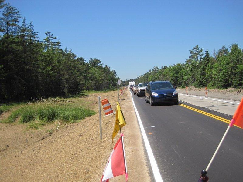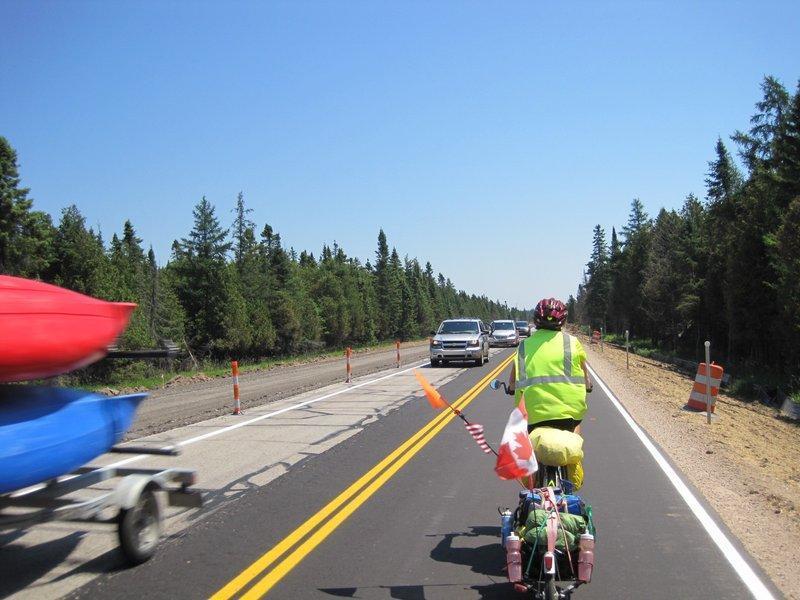 This all changed when suddenly our shoulder was gone and we were in to a 10 km construction zone. We immediately implemented our emergency strategies: own the lane, hope not to get run over straight on, wait for when it is safe for cars behind to pass, then pull to the white line. Hope that people passing did not cut us off or swerve into us to avoid oncoming cars. In this case, there was heavy oncoming traffic so it was not too often safe for passing. We accumuulated up to 30 cars chafing at the bit behind us. We pulled to the gravel and let them by, then looked for the safe time to grab control of the lane again.