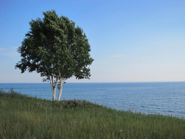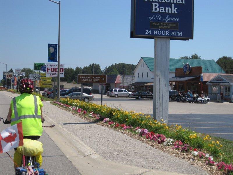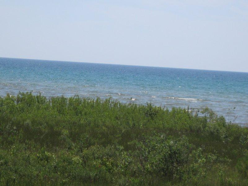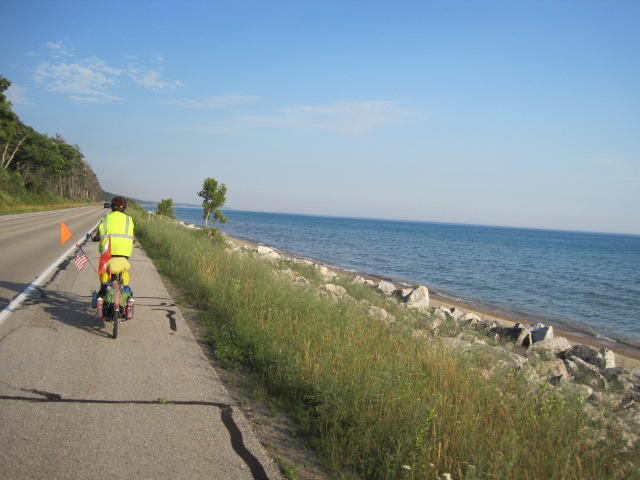 We didn't see anywhere to camp around Naubinway and the flat road just lead us onward. It runs along the lake shore in a broad arc down to St. Ignace and has to be one of the most beautiful rides around. There are two national forest campgrounds along this shore. We were enjoying the ride so much that we did not even look at the first one. The second one is at "Lake Michigan" recreation area, about 30 km from St. Ignace. We found it to be dark and buggy and crowded. Moreover, the $18 fee seemed excessive for the sparsely placed pit toilets and park host that we would have to hunt up way down at the other end of the facility. So we pushed on, elated by the lake and confident that we would came up with something, closer to St. Ignace.