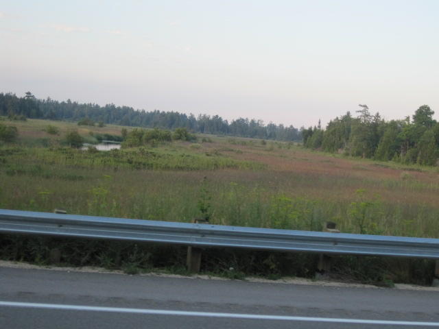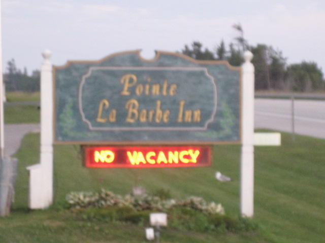 Now darkness was coming on, and we lit up all our flashers. The fourth motel was the Point LaBarbe Inn and Cabins. Also no vacancy, but we roused out the ma and pa owners and asked just for a spot to put the tent. They distinguished themselves among all the kind and helpful people we have met on the trip by refusing, and so sent us out onto the darkening highway. We hope that any readers of this that find themselves near St. Ignace will studiously avoid giving these people any business.