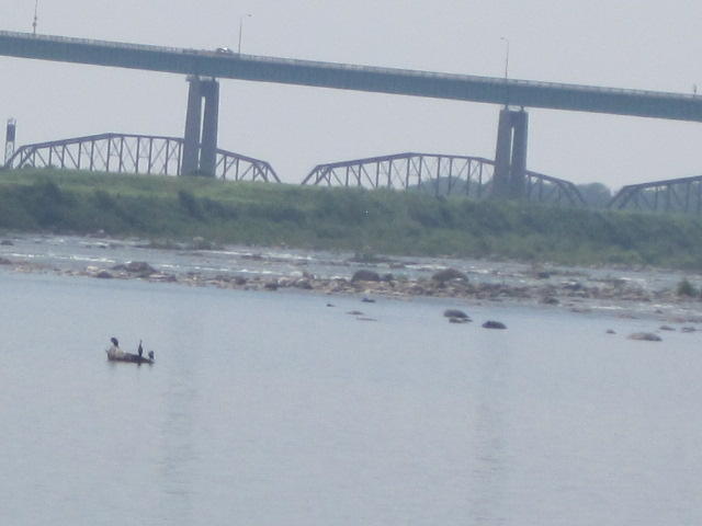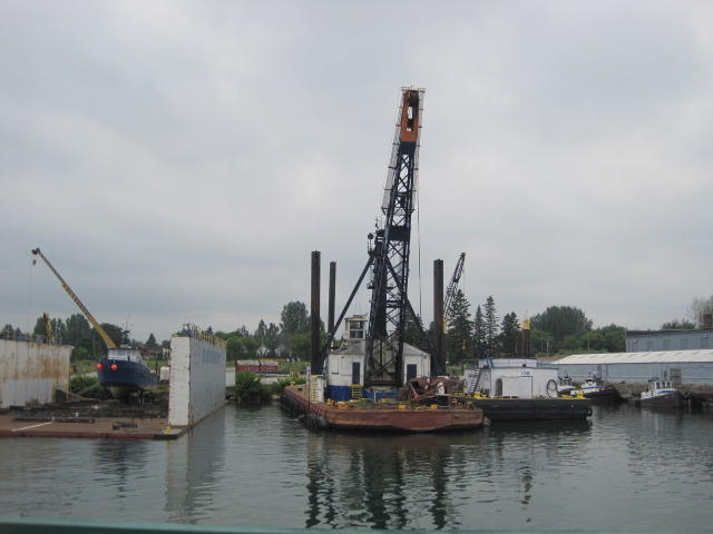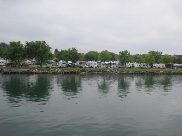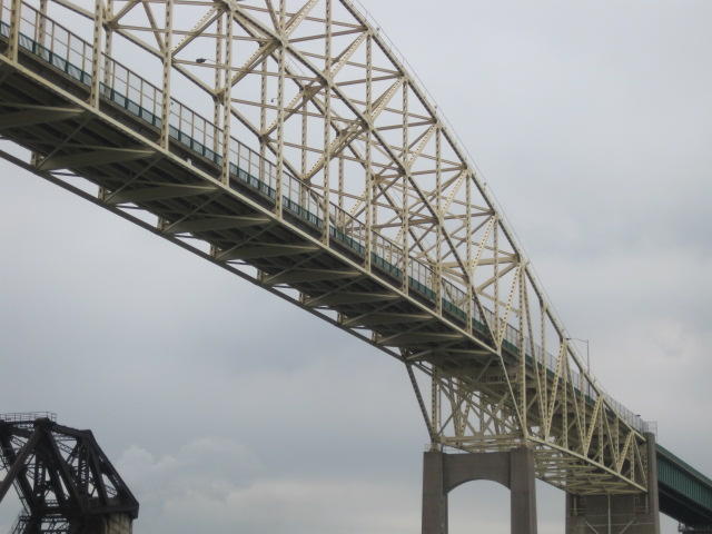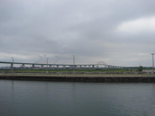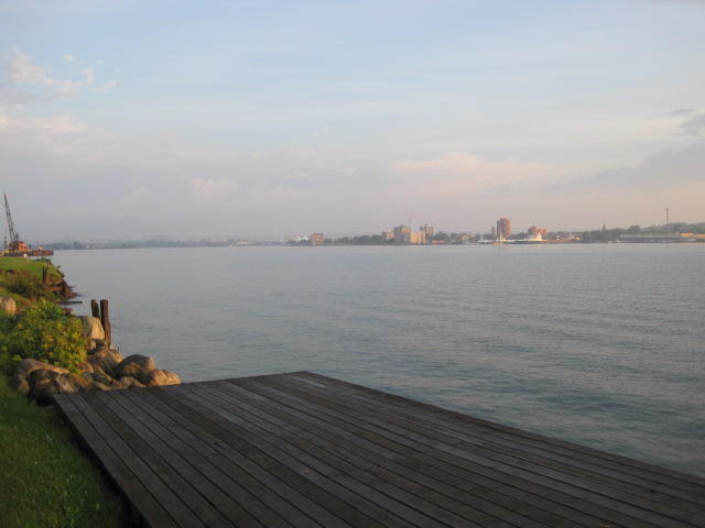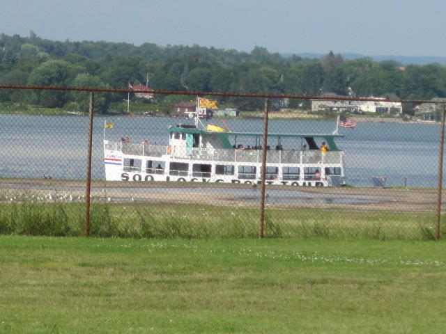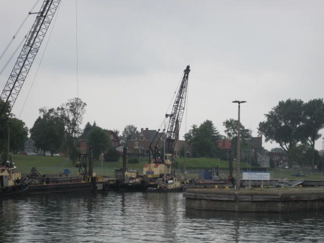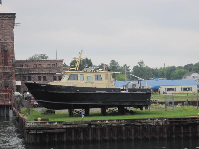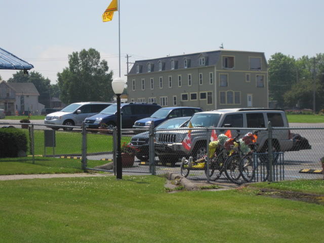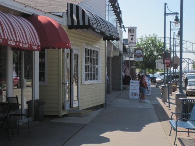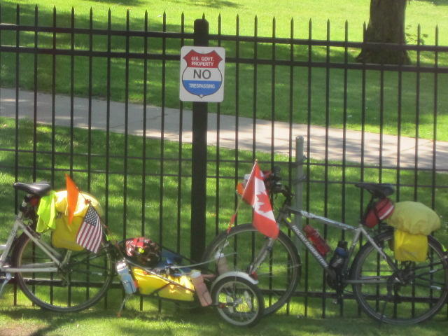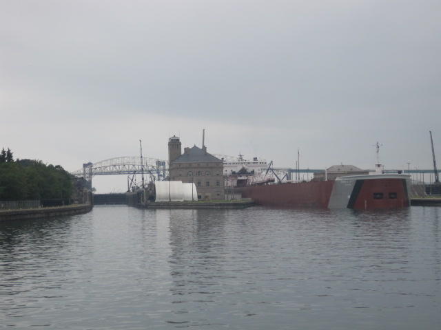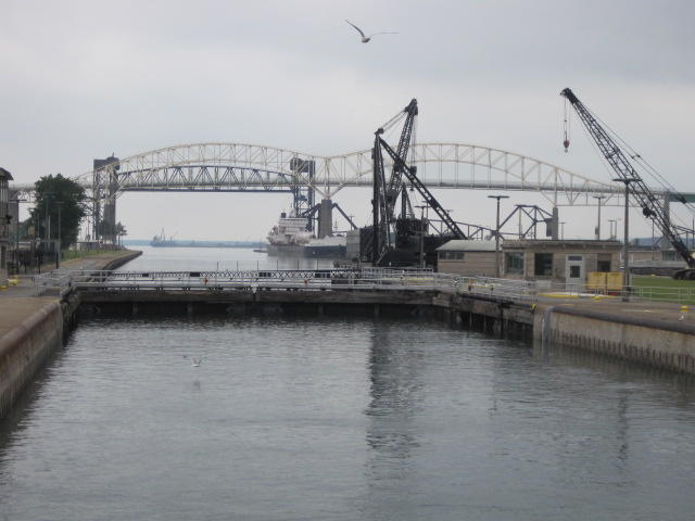 Back on shore we found yet another restaurant. This was the Captain's Pub and Grille in the historic Ojibway Hotel. The room was large and well air conditioned. Oh my. It took a while to cool down, and then a level of comfort we haven't felt for some time. The bikes had to wait outside. They were beside a threatening sign on a fence beyond which are the locks. The US government threatens to search anyone who approaches the locks or the visitor centre. We just stayed away from it.