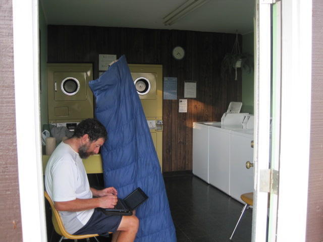 The storms last night were truly awesome, though we missed a lot by hiding under our sleeping bags. This morning we found that though the tent had stayed up and basically done its job, the floor inside was pretty wet. Our silk sheets (yes, silk sheets) had wicked up a lot of water and were soaking.