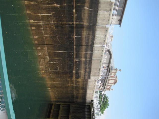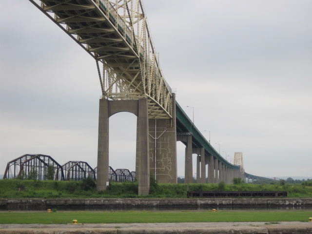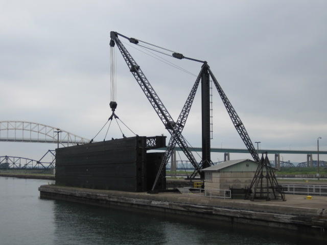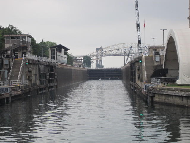 The locks on the Canadian side. When the 1800's vintage locks collapsed, new ones were built inside the old ones, but shorter. The old lock gates are still visible, and the admin and other buildings are part of a national historic site.