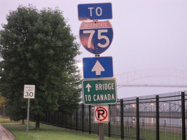 This is a toll bridge and we had to pay $3. We debated as to whether we shoud go in the truck, bus, or car lane. I felt that as semi-trailers we were closer to trucks. Anyway, after paying we had to back out and go up on the grass - they did not want their in ground gizmo to count as three axles, though of course, we are!