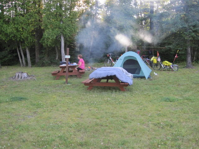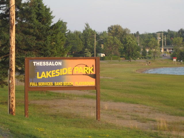 We have not yet seen the town of Thessalon, because we hit our campground before coming to downtown. Lakeside Park has a long sandy beach, showers, and there was lots of space for us. There is the customary RV slum, but we are used to that now. We picked up branches and birch bark enough for a campfire, and after a walk by the lake are happy as can be. We set our alarm for 4:30 a.m. though. Don't ask about 'happy' then!