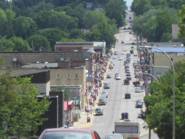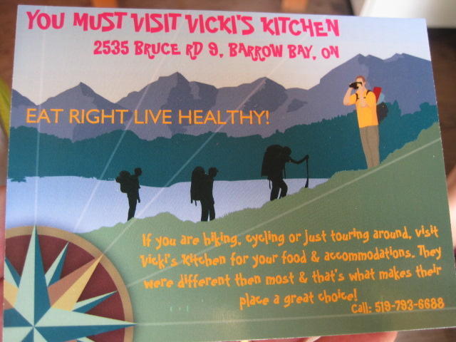 Wiarton seems to be built in a hole, with a steep descent on highway 6 into and an ascent out of town. The town has a promising lineup of brick buildings housing various businesses, but we spotted only one likely looking cafe - the Green Door. Shades on the windows make it look a bit dodgey, but inside it is quite OK. Also OK were the salad components of the offerings, but not OK was the female ballad singer type muZak coming from speakers overhead, the pre-cooked/not grilled chicken in my "souvlaki", the difficulty in getting enough water brought to the table, and worst of all - a wifi router sitting on a counter but a denial that anyone knew the password or anything about it.