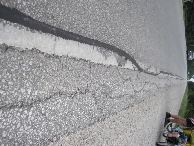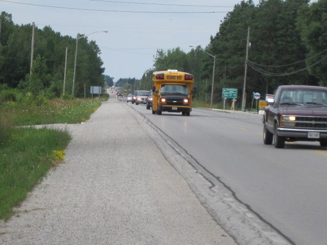 Wiarton (or environs) continued to give us the willies after we climbed out the far side. Here half the temporary population of the peninsula seemed to have decided to rush back to Toronto. At the same time, the shoulder deteriorated to twelve inches of broken pavement. Running beside and within the twelve inches was a band of tar that was either soft from the sun or dished or something, but the bikes skittered away from it, so there was no question of using the shoulder, however meager. Meanwhile, the well rested but still hyper Torontonians tried to elbow us off the road, sometimes honking irritably.