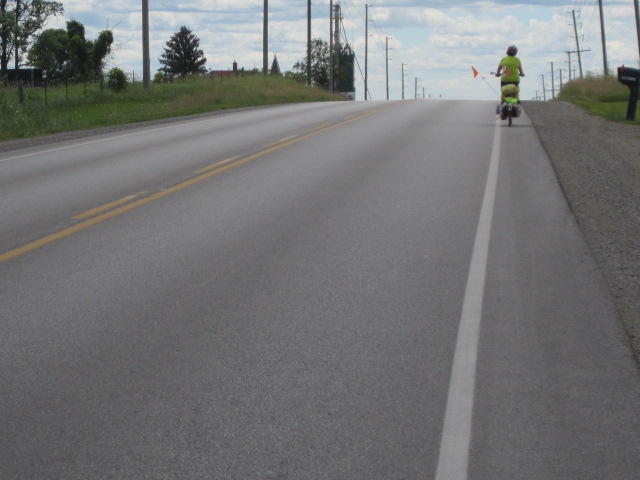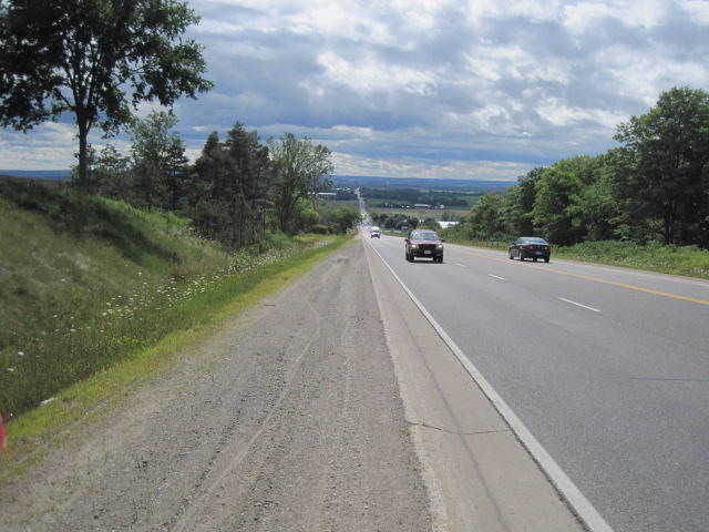 Even though there was no shoulder at all on 10, the surface was smooth and the traffic lighter. Better, drivers seemed to suddenly have learned some manners and many slowed down before passing. After Angus the road also developed a shoulder of sorts, making it quite a good ride.