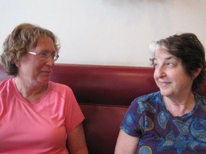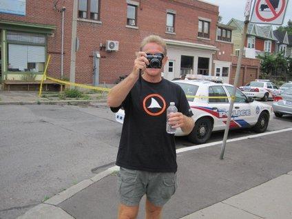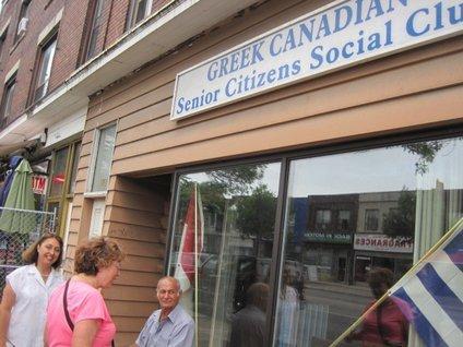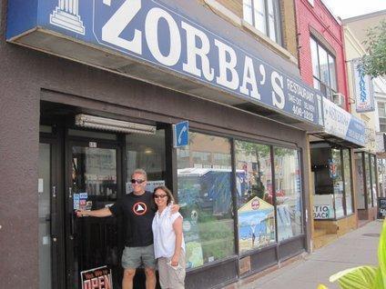 James and Diane drove up from St. Catharines this morning to see us and help us experience the big city. Our total plan was to walk down Danforth Ave to the blocks that feature Greek restaurants. On Danforth, Diane stopped at the Greek Senior Citizens Social Club, where an old man was sitting in front. (I better watch out who I am calling old, though). We asked about which was the best of the restaurants, and he proposed Zorba's. The man listened to our improbable tale of cycling from Victoria and was suitably impressed, wishing us good luck on the rest of the journey. So chalk one up for friendly Toronto locals.