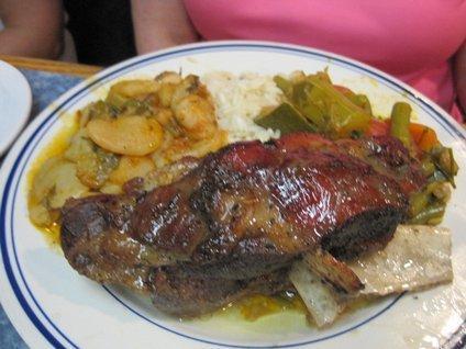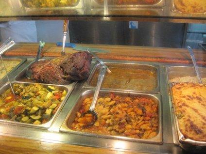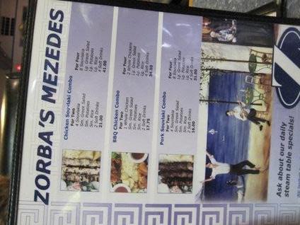 Zorba's is set up on exactly the "traditional" pattern (where "traditional" refers only to what I had been used to in Montreal, but I am sure it's the same in Greece). At the front of the restaurant along one side is a glass fronted counter housing a steam table. The steam table displays the food available, typically roast or stewed meats, roast or stewed vegetables, rice, and potatoes either in quarters or mashed and baked. The table is overseen by one or more older men, who must be rather brusque and serious. Then elsewhere there is a charcoal grill, supporting souvlaki or other grilled meats.