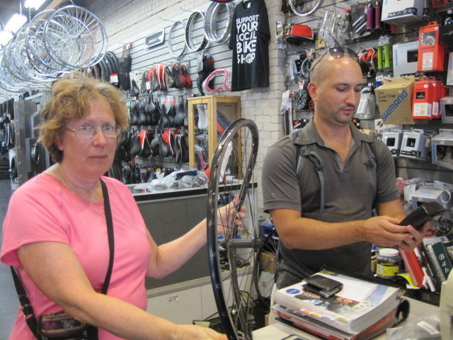 There is one bike shop on Danforth and it is called Cycle Path (ha, ha, they are "crazy"). We picked up two new chains there - we seem to be wearing them out a bit fast. Of course we had a good chat with the staff, and also with a fellow that got t-boned by a pickup. Have a look at his wheel.