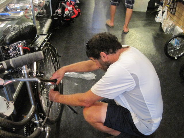 Pulling the bikes from their safe shed, our first stop was Velotique, a store specializing in bike accessories. We found there a stand for Marsha;s bike of the type that grabs the rear stays. It was lighter than the MEC version bit seemed to do the job and be more adjustable. Marsha, of course, had trouble dragging us from such a toy store.