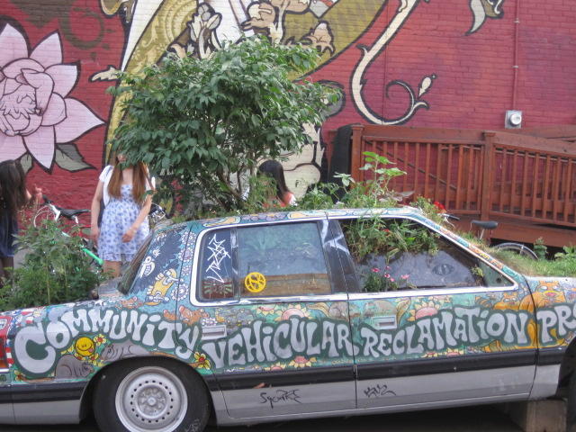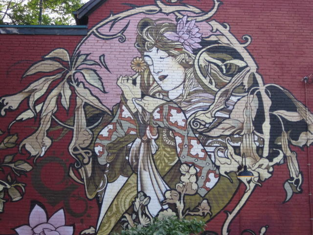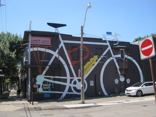 Although Kensington had the requisite fish store and groceries, it does not strike you actually as a market, in the way of Bytown Market in Ottawa or Atwater Market in Montreal. Rather it is a hip area of inexpensive ethnic restaurants and coffee shops, with lots of multiethnic people around. The streets are narrow, a feature Marsha says was put there by the original Jewish immigrants to be reminicent of their eastern European towns of origin. There were few cars, so we could walk our bikes all over the place with no problem.
