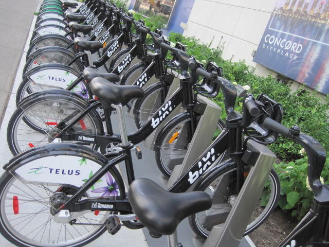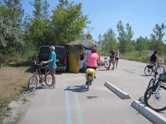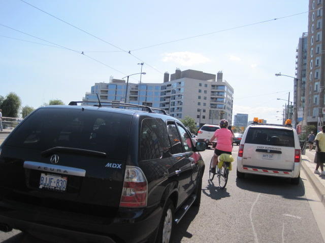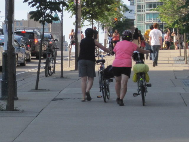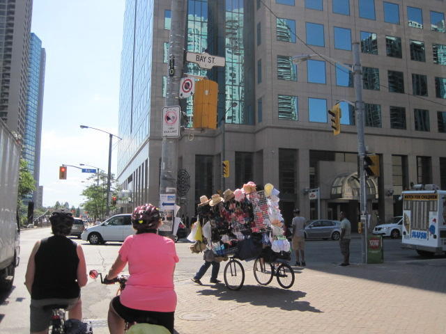 Marsha toured us around Toronto today by bike, to the extent of over 30 km. While we still say Toronto has poor bicycle support, there are some bike lanes on certain streets, and significantly there is the portion of the 900 km Waterfront Trail http://www.waterfronttrail.org/ that runs the entire length of Toronto's waterfront. This provides a tremendous safe east-west corridor across the city for cyclists, and no doubt we should have been on it when we first fought our way over to Marsha's house.
