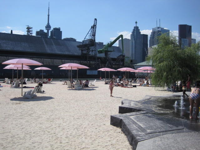 One of the more interesting corners of the lakeshore is Sugar Beach. This is literally in the shadow of the skyscrapers, and is named for its proximity to the Redpath Sugar refinery. Yet here in an idyllic pocket children play in water jets and people lounge in the sand under beach umbrellas.