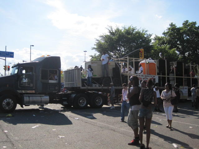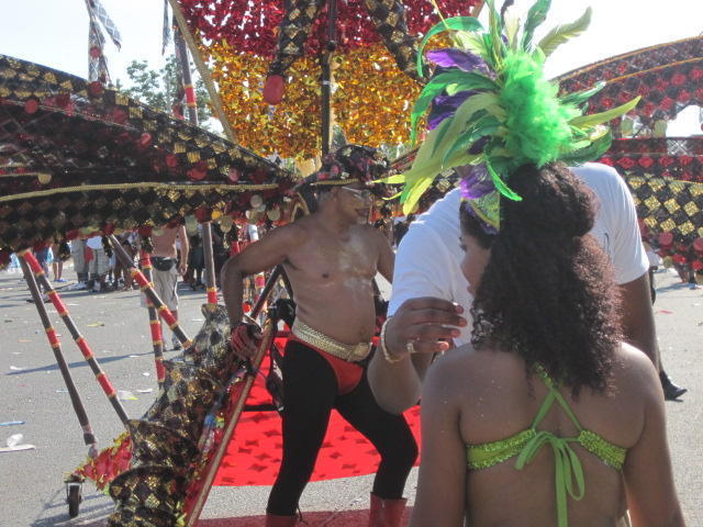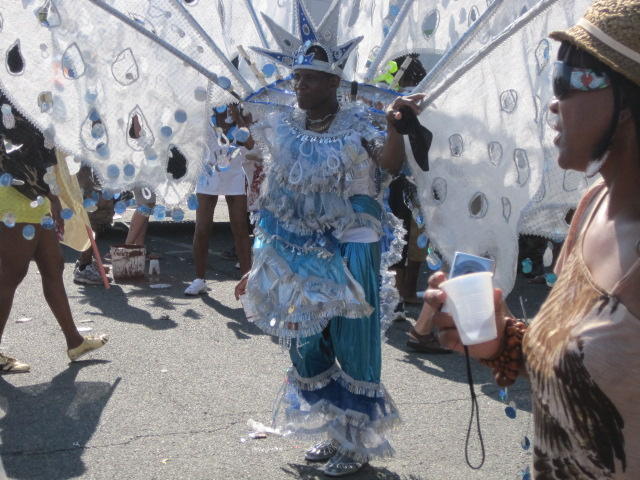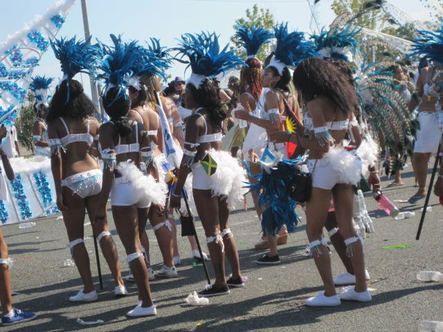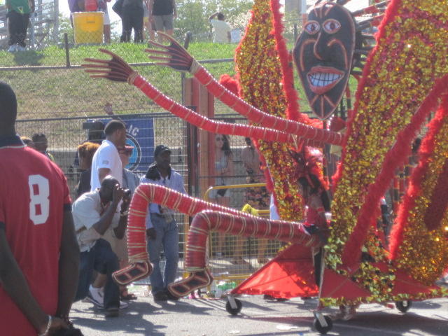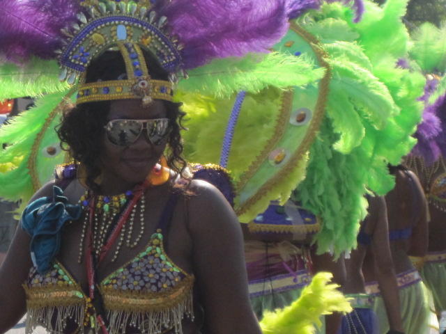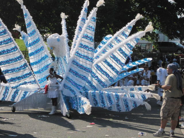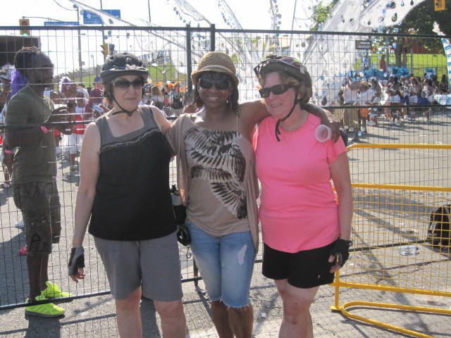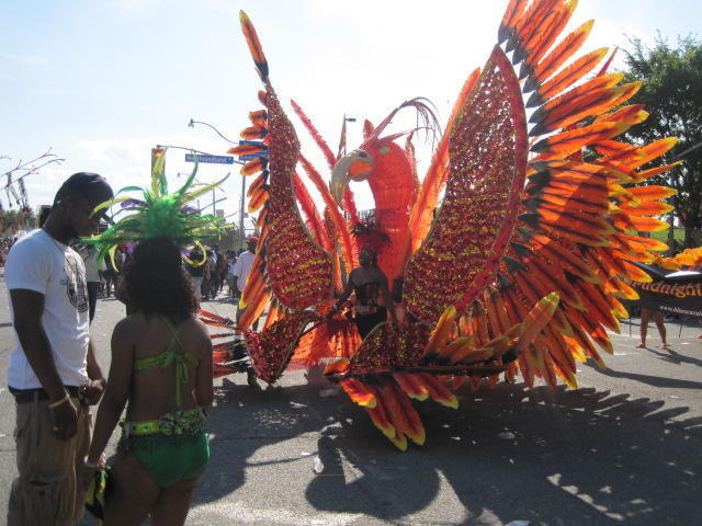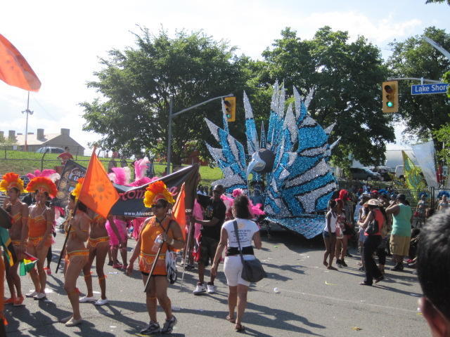 and finally down the closed off Lakeshore Drive, wending our way through increasing numbers of people. Finally we arrived at a spot where the annual Caribana parade was entering the street. From behind crowd control fencing we watched the incredible gaudy one person "floats" or costumes, some with supporting outrigger wheels, as well as flocks of costumed and gyrating marchers. The rhythm was provided by bands on semi trailer trucks with giant speakers. Power for this was provided by huge on board generators, and of course it was impossible to talk over the level of sound being produced. Previously we had only seen costumes and exuberance like this on PBS specials about Mardi Gras, or Samba contests in Rio. The whole thing was in real life here and quite something to see.