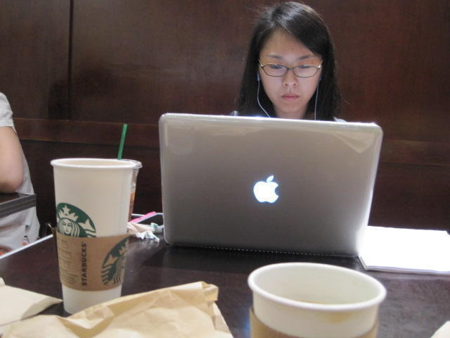 In Starbucks we "shared" a table with this girl. She never glanced up from working on her Apple in deadly earnest. Some judicious peeking revealed she was studying display advertising in the Google system.