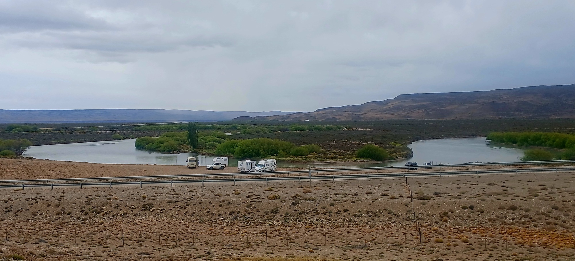 Progress the whole afternoon to 18.30 is little more than walking pace. I am exhausted and feel nausea. A strong gust pushes me off the side onto the gravel shoulder. Restarting the same happens a few metres on, so decide to camp by the culvert that I'm level with at the moment.