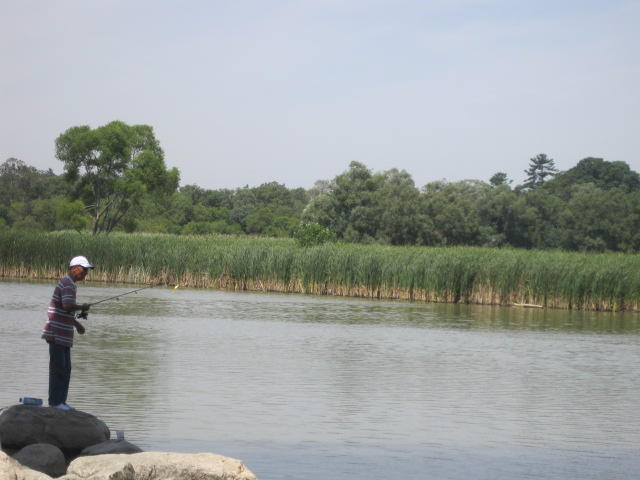 There was no signage at all (what else is new) and we landed up at a lagoon with a parking lot, where several people are fishing. Rather than hunt up a campground here, we are just going to throw down our tent and collapse. The distance was not great, but today's impediments were moderate heat and humidity and food that makes you weak rather than strong. We do have some medjool dates that Dodie and Marsha found in Little India. A supper of these probably worked for Lawrence of Arabia, so it will work for us!