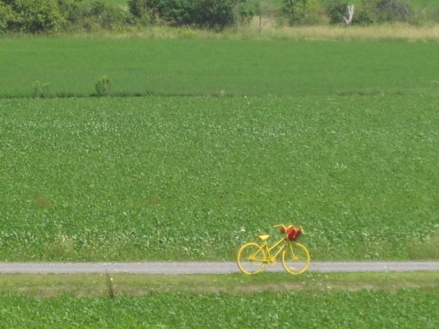 Just down the road, a yellow painted bike stood in the middle of a field. Another strange sign from heaven? or are Ontario farmers going into raising yellow bikes?