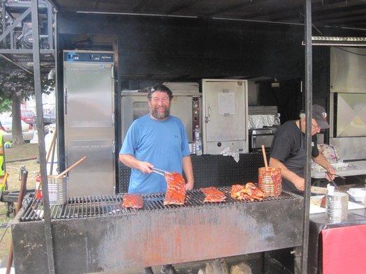 For the second straight day we struck it lucky by coming when a market was ongoing. In this case, the Ribfest was not just a market but a bit of heaven for anyone into BBQ! We found it by asking a local couple on the street what would be a good place to eat in Brockville, and it turned out they were on their way to Ribfest. At first it looks like a fair or farmers' market with hopefully some food stalls, but when you turn a corner, wow! There are many trailers set up, each with full blow BBQ facilities. That is, behind the cooks are shiny stainless steel ovens and warming cabinets and refrigerators and in front of them are large flat BBQ surfaces. They are cooking up pork ribs and chicken on these in large quantities, with appropriate amounts of smoke and flame. Above the trailers are 30 foot high garish billboards containing many smaller posters covering past contest wins of the trailer, prices, and general claims. The set up for each trailer is exactly the same, making for quite a display!