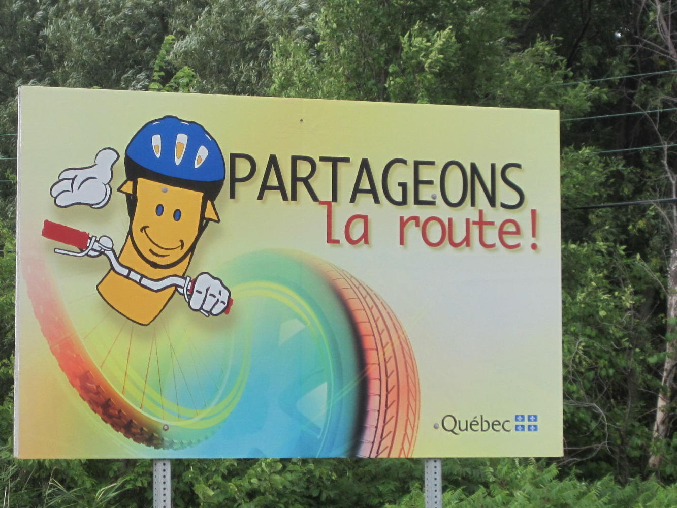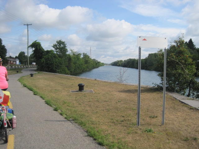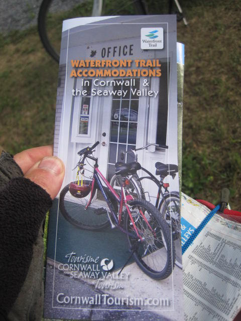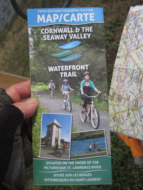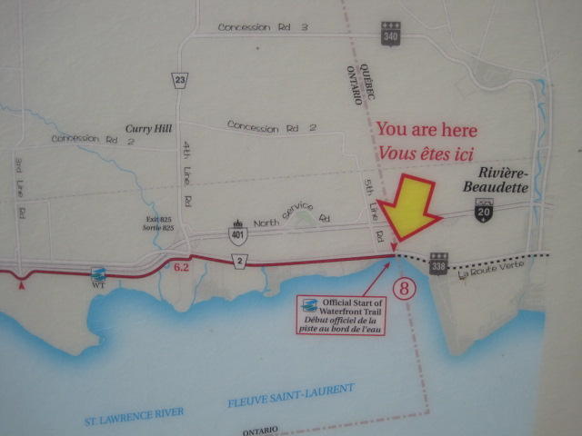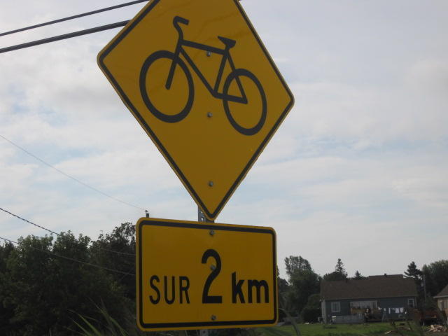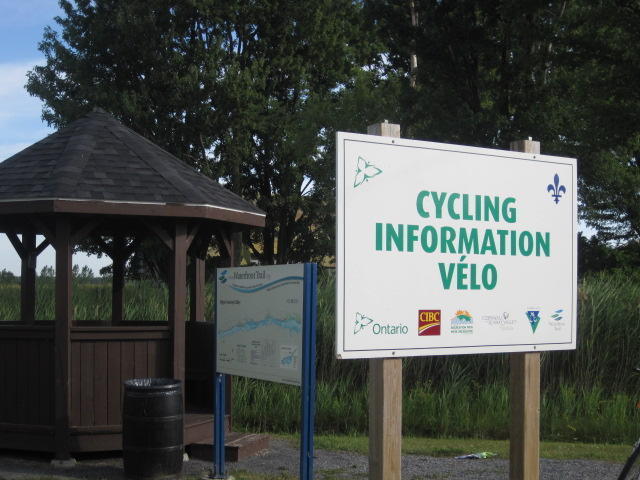 South Lancaster is the last town before the Quebec border. We soon reached it and were treated to all sorts of photo worthy landmarks. Road markings turned to French, there was a kiosk with pamphlets about the route behind us and the route ahead, and a sign that included some of our old and new favourite trail logos.