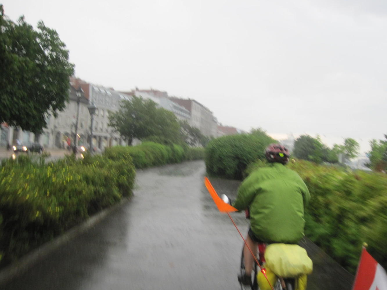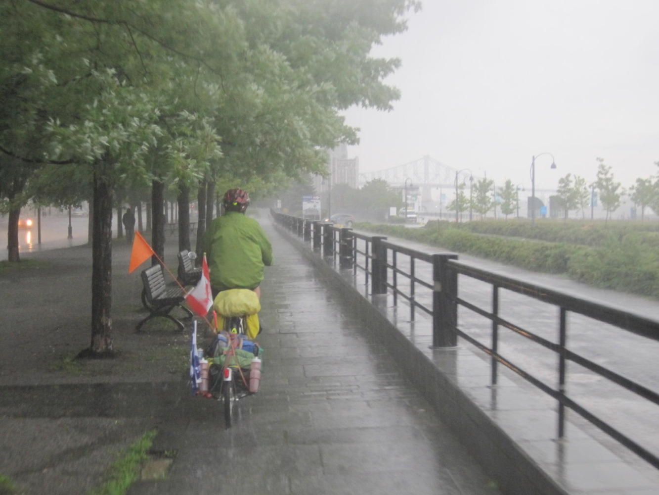 Of course, the cycling/touring gods were not willing to just let us cruise into the city unopposed - that would be so much out of character for them! So lightening flashed, thunder thundered, and the skies opened as we came to Old Montreal. The rain bounced high off the pavement, and our cue sheet faltered. We asked directions once and even gave the Garmin a turn. Finally we approached Josh and Sabrina's street. The gods gave up, the rain stopped, and wait for it ... church bells pealed. We had made it!!
