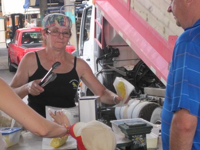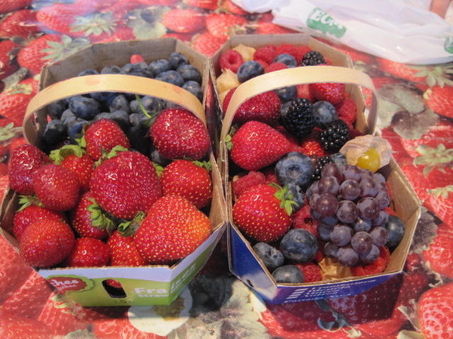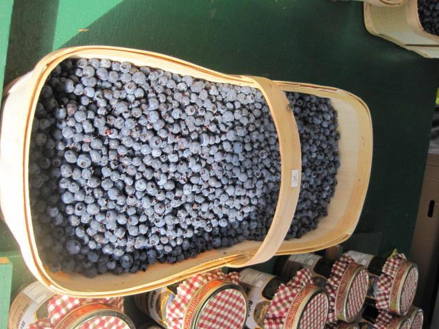 We began our visit by sitting in an open but covered area, near a large stall making fruit juices. They had vast quantities of fresh fruits cut up and ready to go, and were (hand) cranking out smoothies and blended juices for a continuous stream of customers. We joined that stream more than once, more than twice, because fresh juice is so good. We spent about $30 at this stand before even entering the market itself. The photos below will take you on a little tour. Note the blueberries. As we left the market we sampled just one from our bag. Oh my. Just one contained so much blueberry zap it was amazing. Later, with the local strawberries and Ontario peaches it was fructivore heaven.