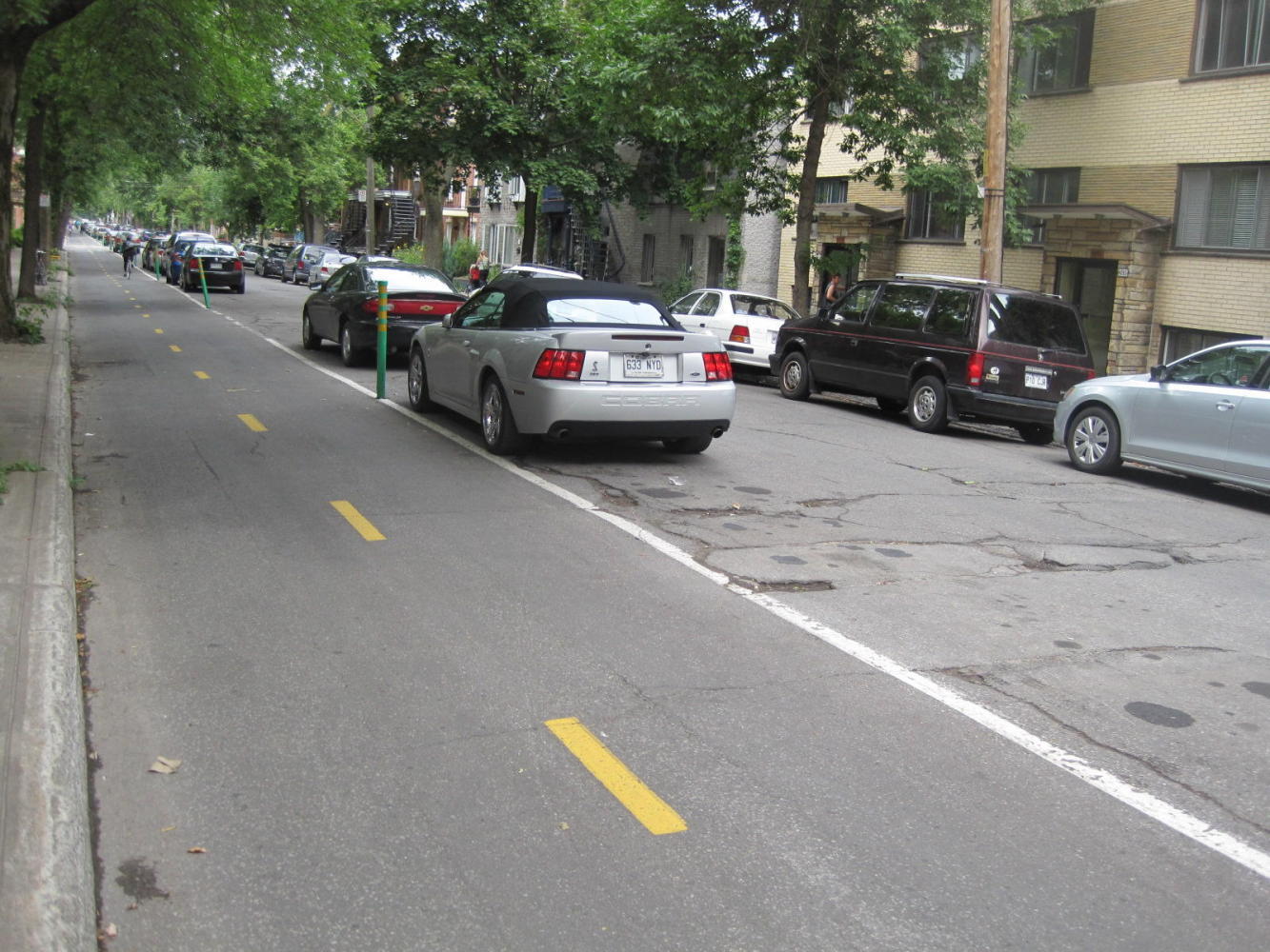 Look at this lane set up. Two way cycle path, then car parking, then a single car lane, then car parking. It seems pretty fair, except maybe there should be a bicycle parking lane, with a Bixi bike station!
