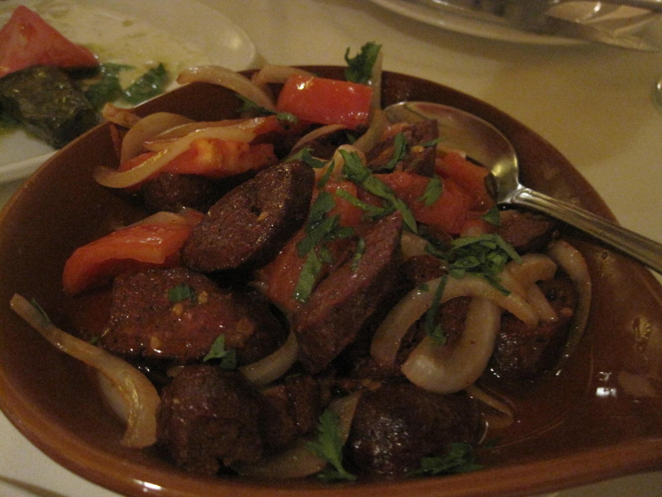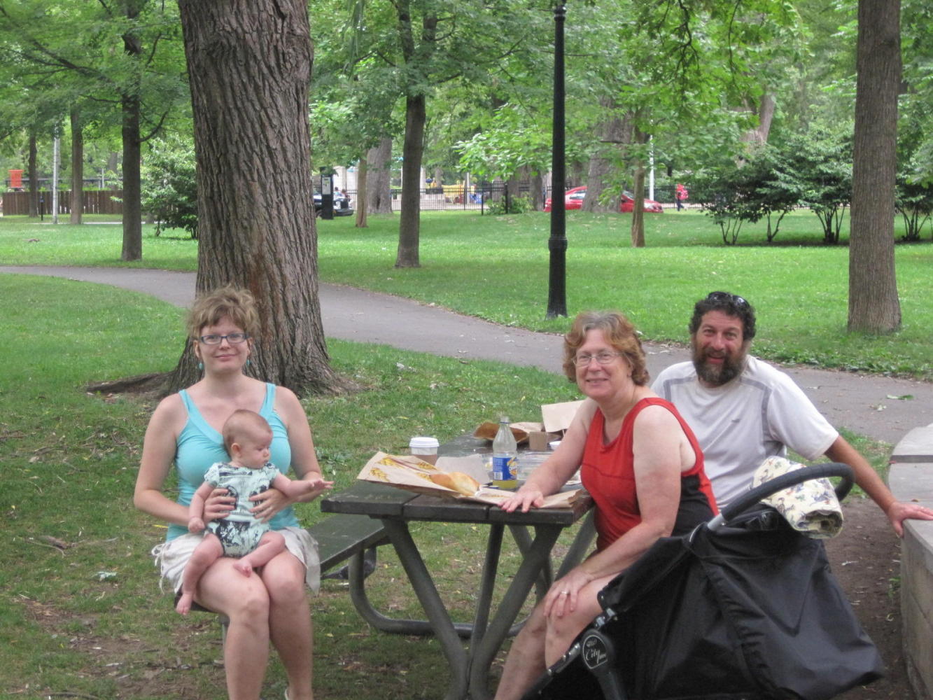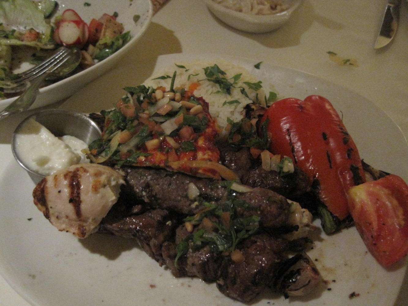French is the second language of Lebanon. Consequently a lot of Lebanese have come to francophone Quebec. One benefit of this is in the number of Lebanese restaurants. We had the chance to go out to one, with my brother Harold and his wife Francine plus Josh and Sabrina (and Amelia). We did one of those slightly crazy things where in effect the waiter had license to bring us anything and everything on the menu. As he did so, he explained what each thing was, and even went into the detail of how the Lebanese version of things differed from the Moroccan version. It was great, and looked in part like this: