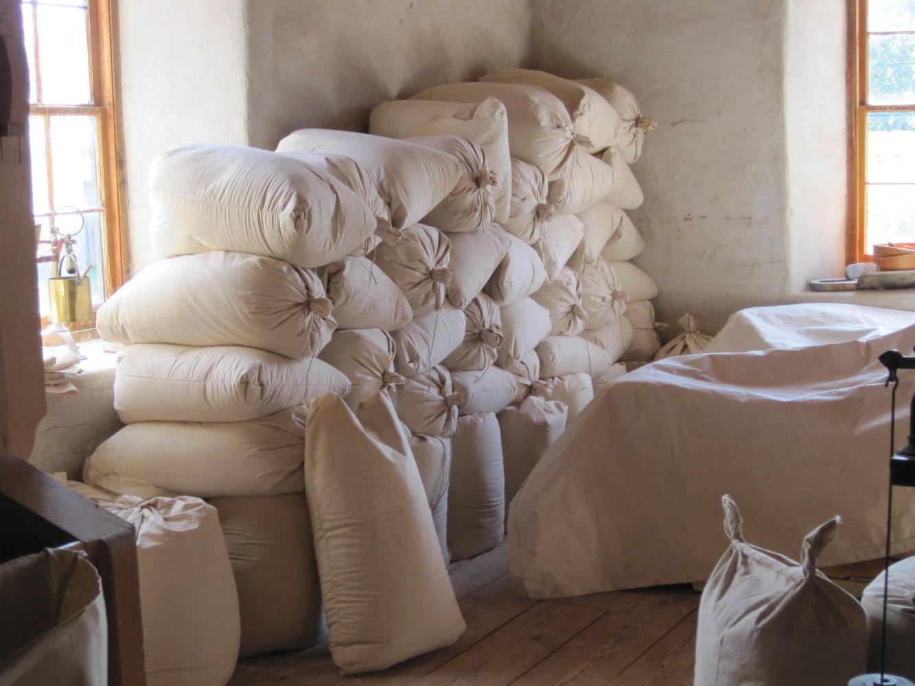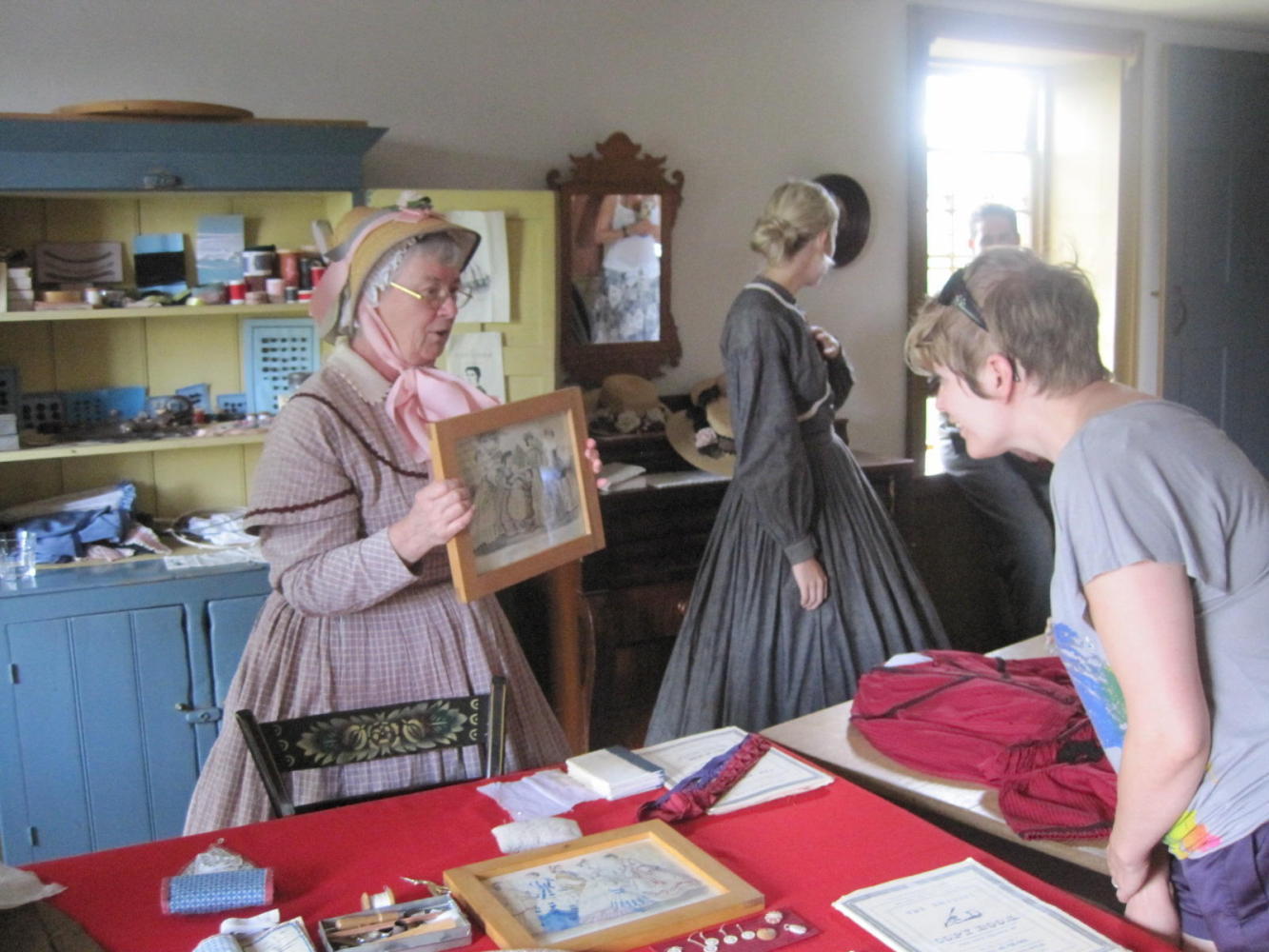 Each of the places where something was being produced (flour, lumber, cheese, bread, etc.) still produces those items, with production being done by people in period costumes. These people will explain what they are doing, and usually manage to stay in character. For example, if you ask the miller what they do with the flour, the answer should be that it goes to the village bakery (which is true, plus is shipped in barrels to England.
