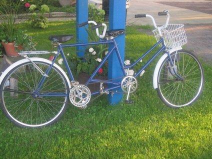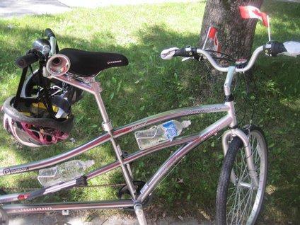 A unique tandem just standing in front of a house. The "ladies" seat is in front, so clearly the lady is in front directing while the man provides the power from in back. Typical!
