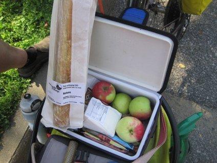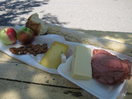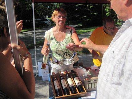 Dodie happened to turn her head and spotted a farmers' market. That called for a hard right! At markets in BC, Montana, and elsewhere there is certainly lots of good stuff. But at this market the vendors often wore white chef's outfits and their stuff was not just good and wholesome, it screamed "gourmet". What other markets offer wine tasting, with baguettes and artisanal cheeses nearby?