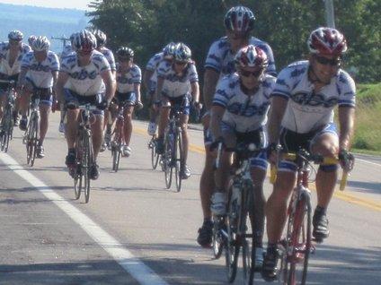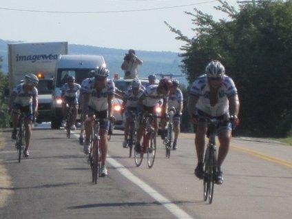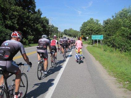 Another ubiquitous thing was bike riders, 100% of whom were dressed as for the Tour de France. We encountered at least 30-40 independent cyclists. Then these guys blew by. Clearly Dodie is losing any race that may be on.