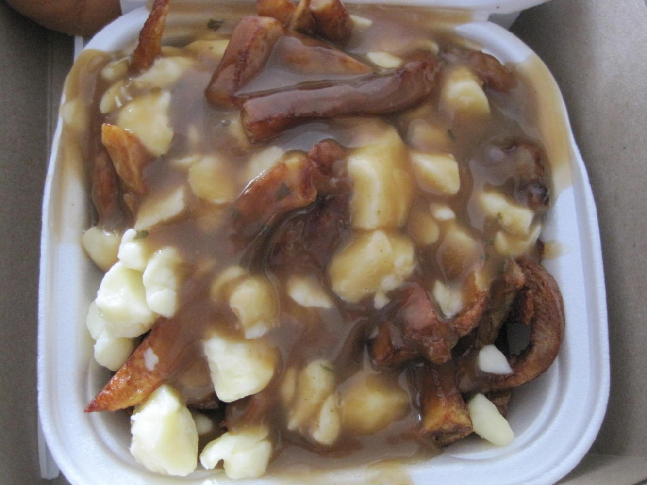 One step lower on the culinary ladder is the Poutine. Poutine originated in Quebec and has now spread, I think, to some national or even American fast food chains. Here it is standard (flavourful but highly greasy) french fries, drowned in (as far as Lafleur is concerned) gravy mix and studded with cheese curds. Remember what I said yesterday about the health benefits of eating in this city - forget it!