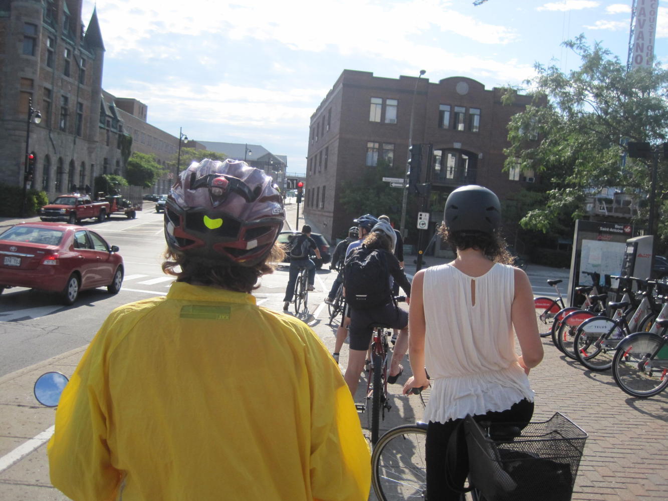 We jumped back on the Route Verte 5, which conveniently runs by the bottom of Josh and Sabrina's street, and began to head West. In the early morning, in fact at any time, the downtown bike routes are heavily used. Here we had to join a lineup of cycles - almost like cars.