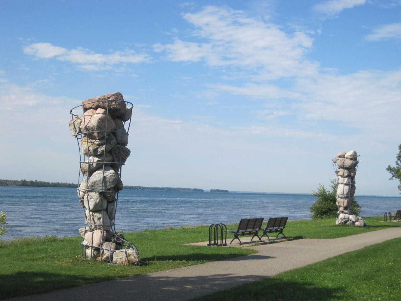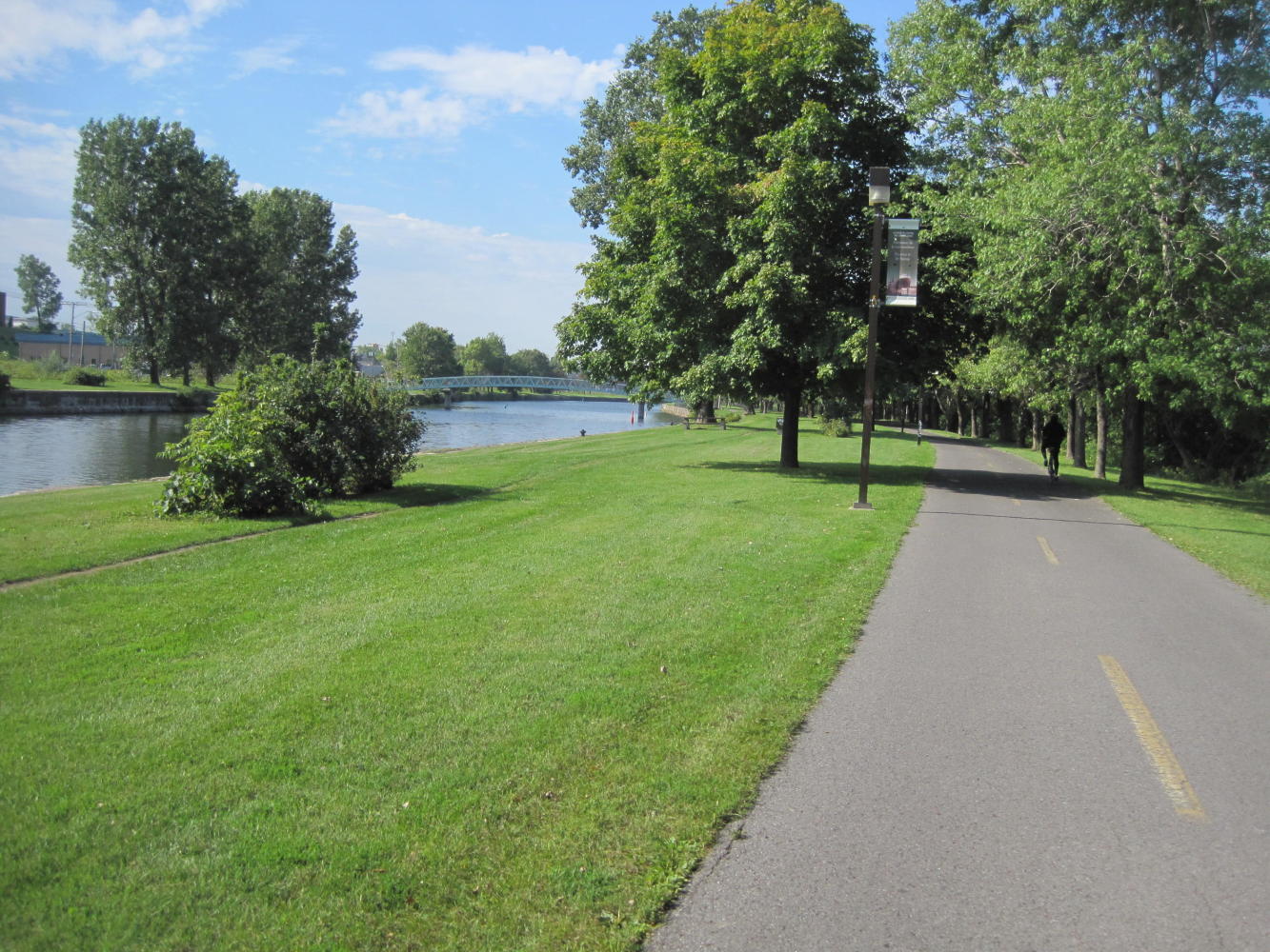 Signage on the route leading West had a few glitches not found in the Eastbound direction. At one point we got derailed onto a 1/2 km long peninsula between the canal and the river that was a park filled with (to me) goofy rock and iron sculptures.
