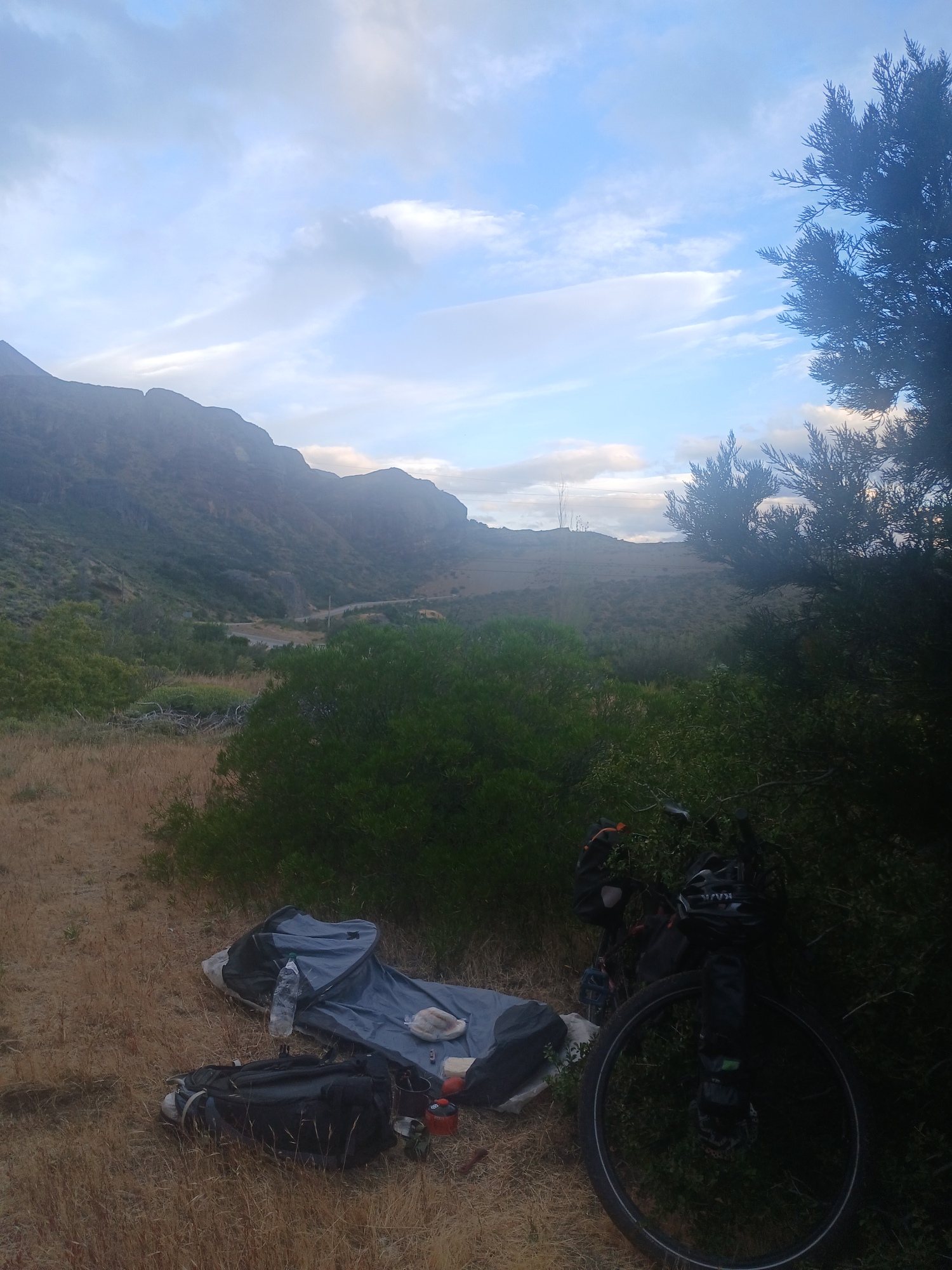 Disembarkation after two and a half hours is to bracing cold wind, overcast sky with spots of rain. A big difference to the arid warmer climate on the other side of the lake. Stop at shop for bread and few other items before riding to campsite where I find nobody about, so ride out of town, passing another campsite with no one there either. I continue on and find a rough lane up off the road to a level area amongst bushes at the bottom of a rocky hill above the village and lay out the bivouac. The hill providing great shelter from the northwest wind.