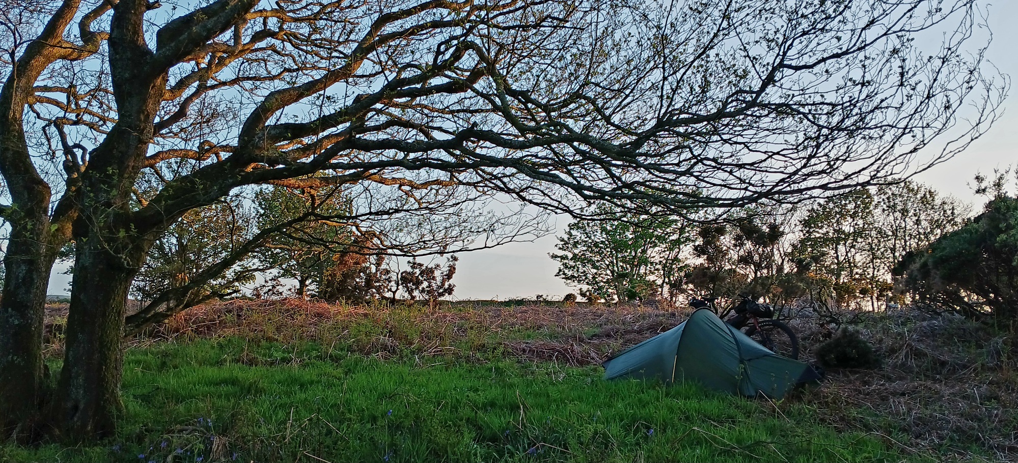 I reach an uncultivated tract of land to the left mainly covered with last year's withered brown bracken and small willowy trees. There is no fence barring entry, so I push the Kona in and find a level grassy spot free of bracken and pitch the tent. I open the radio app and its striking how content I am listening without the distraction I'd have at home of plumbing and kitchen extractor fan. I wasn't listening long as I was soon asleep.