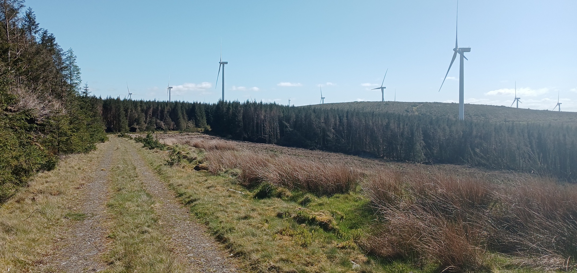 The track ahead has open moorland on the left with parallel train lines off at a distance where bare hills rear up. There is a pine plantation rising steeply to the right and further on, as it gives out to two vehicle ruts the blue line of the Komoot map turns sharp right and I climb up through a tunnel of pine trees.