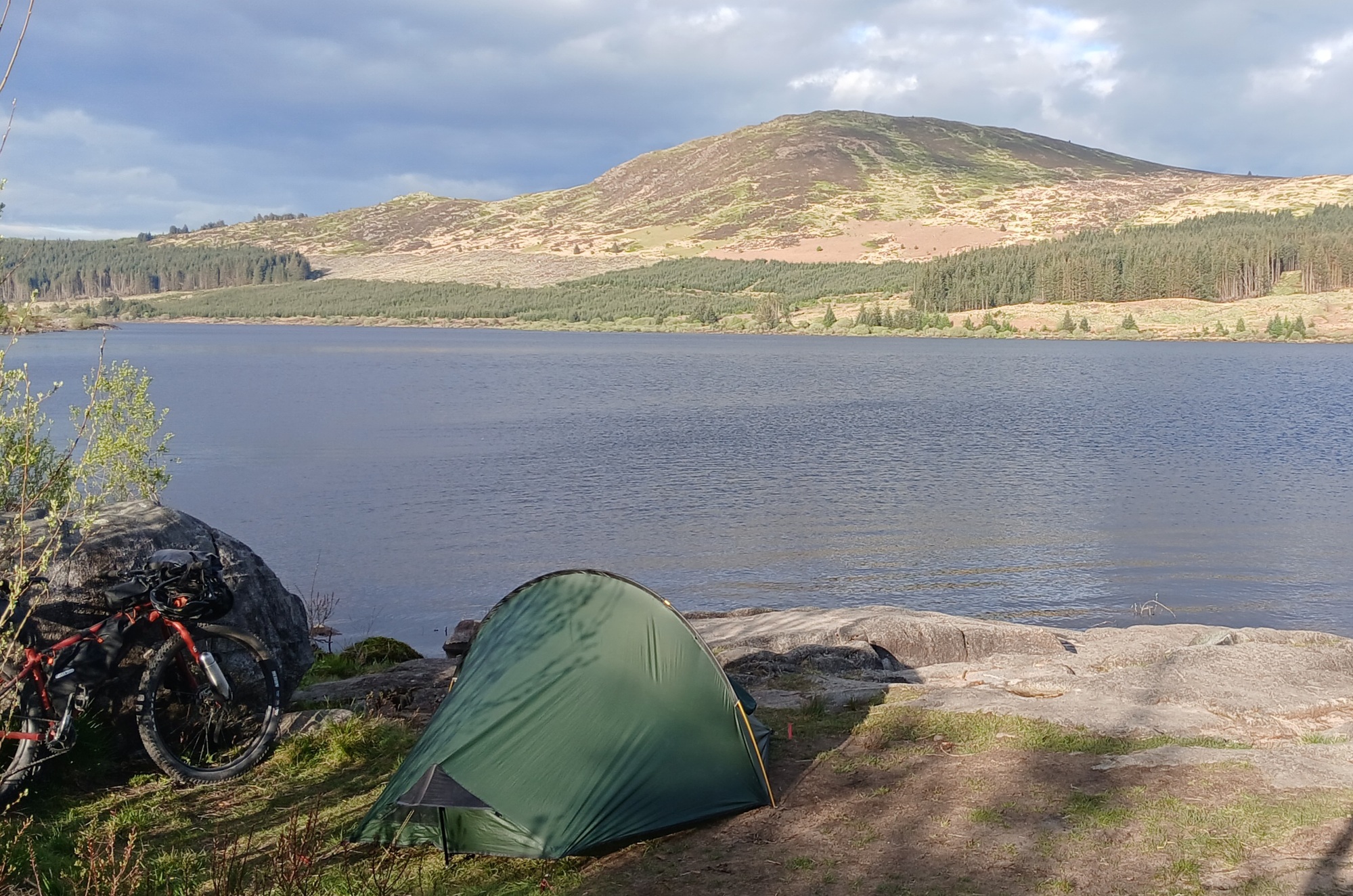 After a rest I continue and approaching evening I turn off along a forest drive leading to a large lake, Loch Doon, accessible to vehicular traffic from the opposite side which meant that most of the prime lochside campsites were taken. However, it is a long loch and I persevere and eventual come to a level grassy spot on the water's edge where I pitch the tent.