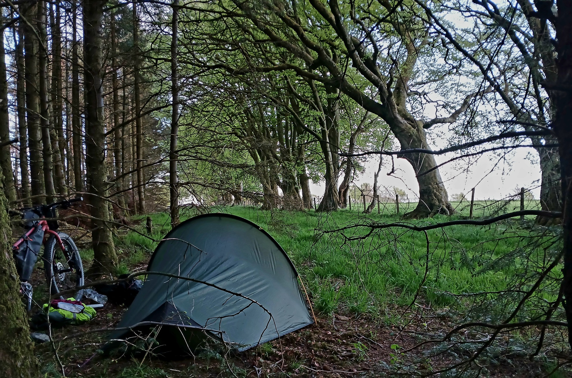 Later I'm on narrow country lanes as I ride to about 7.30 looking out for a block of woodland. Having skirted the edge of Strathaven and half a mile on go right along a small road where I pass a field with a tractor mowing grass for silage. All the fields for the next mile with a break for a large farmyard have already been mown and are in neath rows ready for the harvester, then at the end I see the dark green of a stand of woodland. A block of pine trees on the edge of fields with a wide grassy strip on the inside between the pines and a row of broad leaf trees along the fence. There is even a single-track which aids cycling off the road and about a hundred metres in I clear a spot on the edge of the pines of pine-cones and pitch the tent.