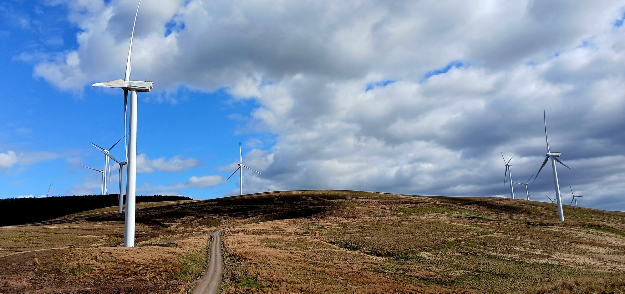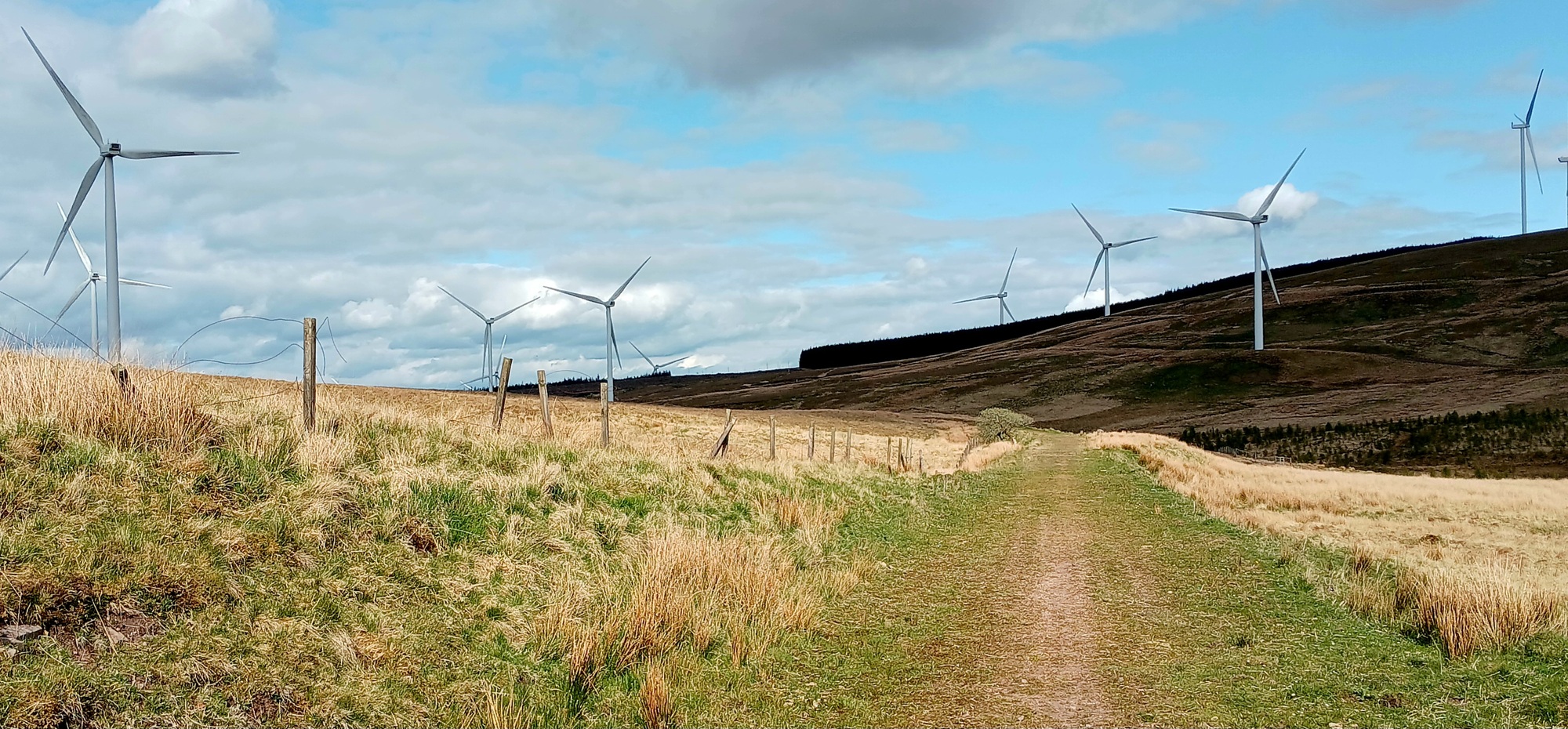 I climb up through a block of pine plantation, followed by a sweeping descent where at last I'm out from underneath the turbines.