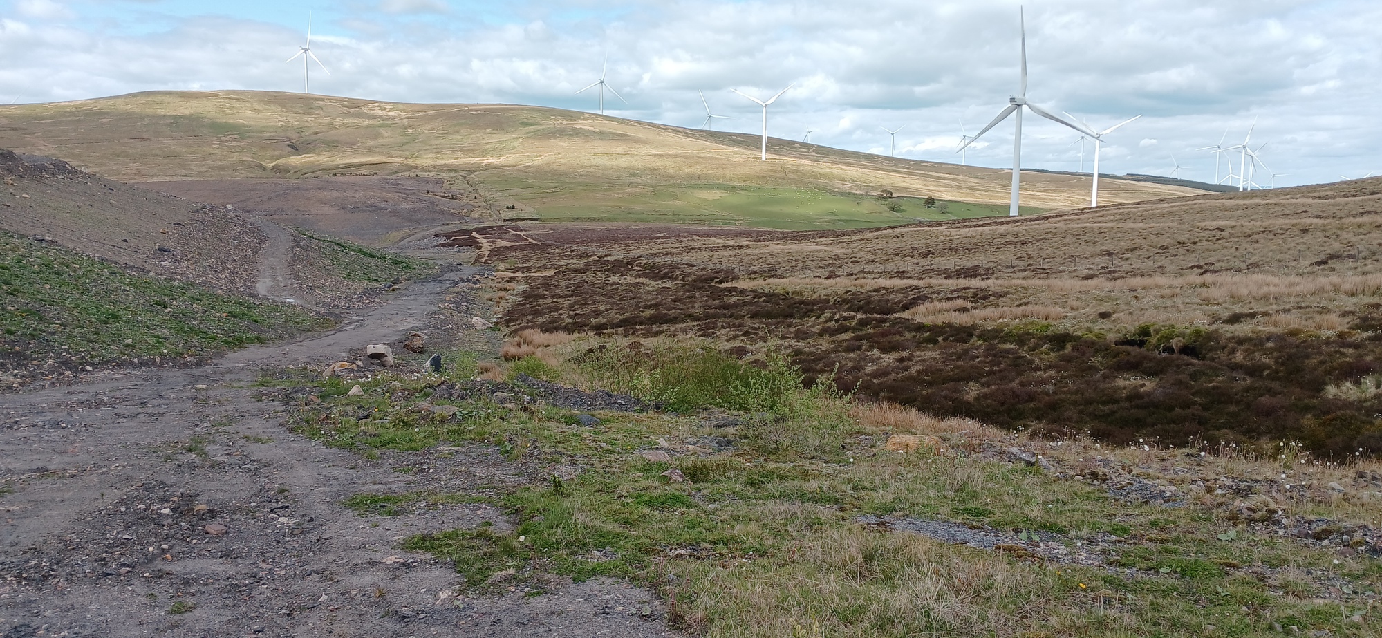 Large cumulus clouds block out the sun, making the northerly wind even colder and after a while it is good to reach the gravel road split off where I climb steadily towards a wind turbine lined hilltop. Then over the crest and steeply down to a deep hollow and up a steep incline on the other side which has me spinning in the lowest gear. The whole hillside has been stirred up and reformed by a bulldozer and going down the next descent is like a moonscape. I'm glad its dry as it would be absolutely miserable if it were raining. I fear the mud would make it unridable.