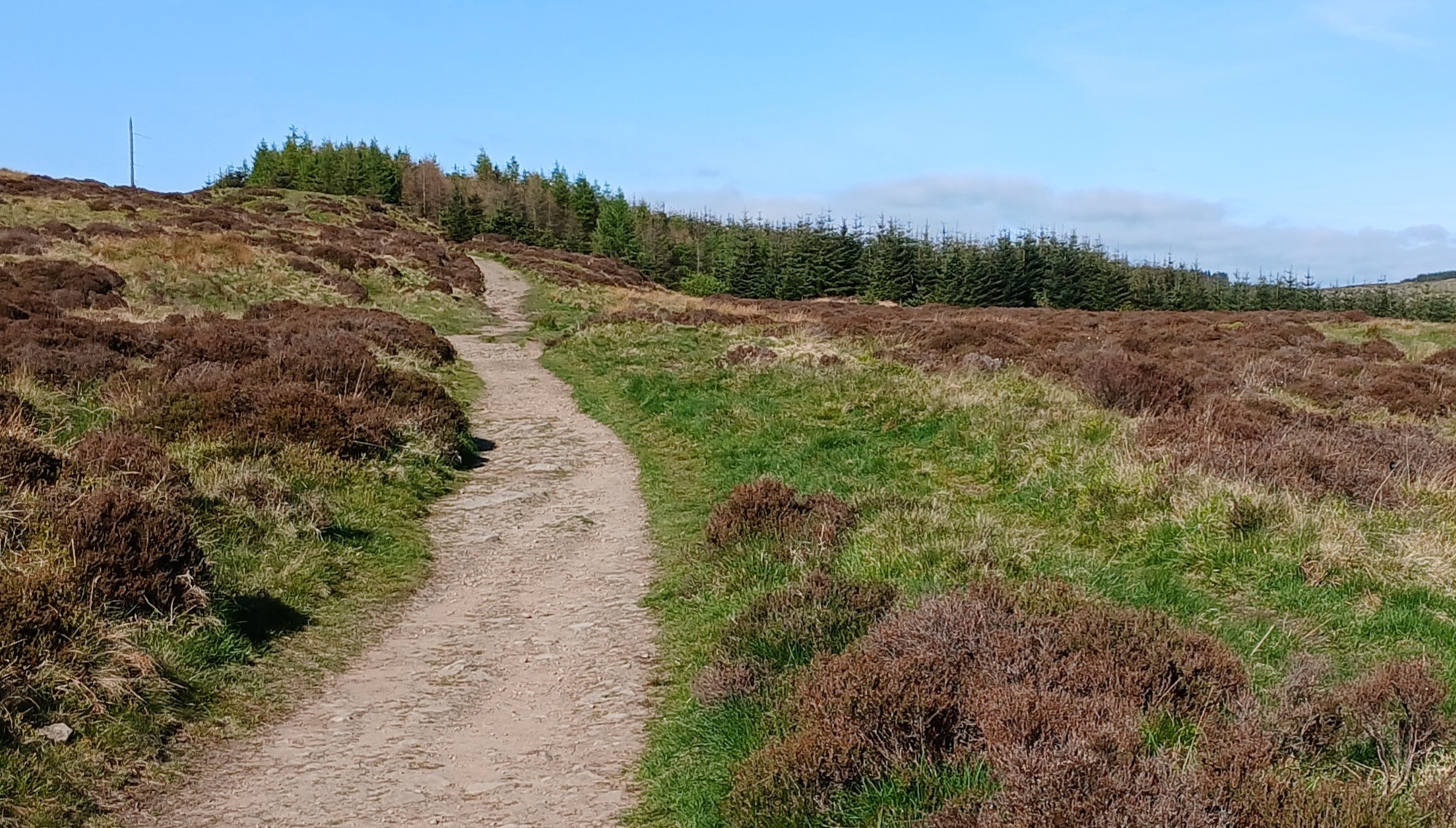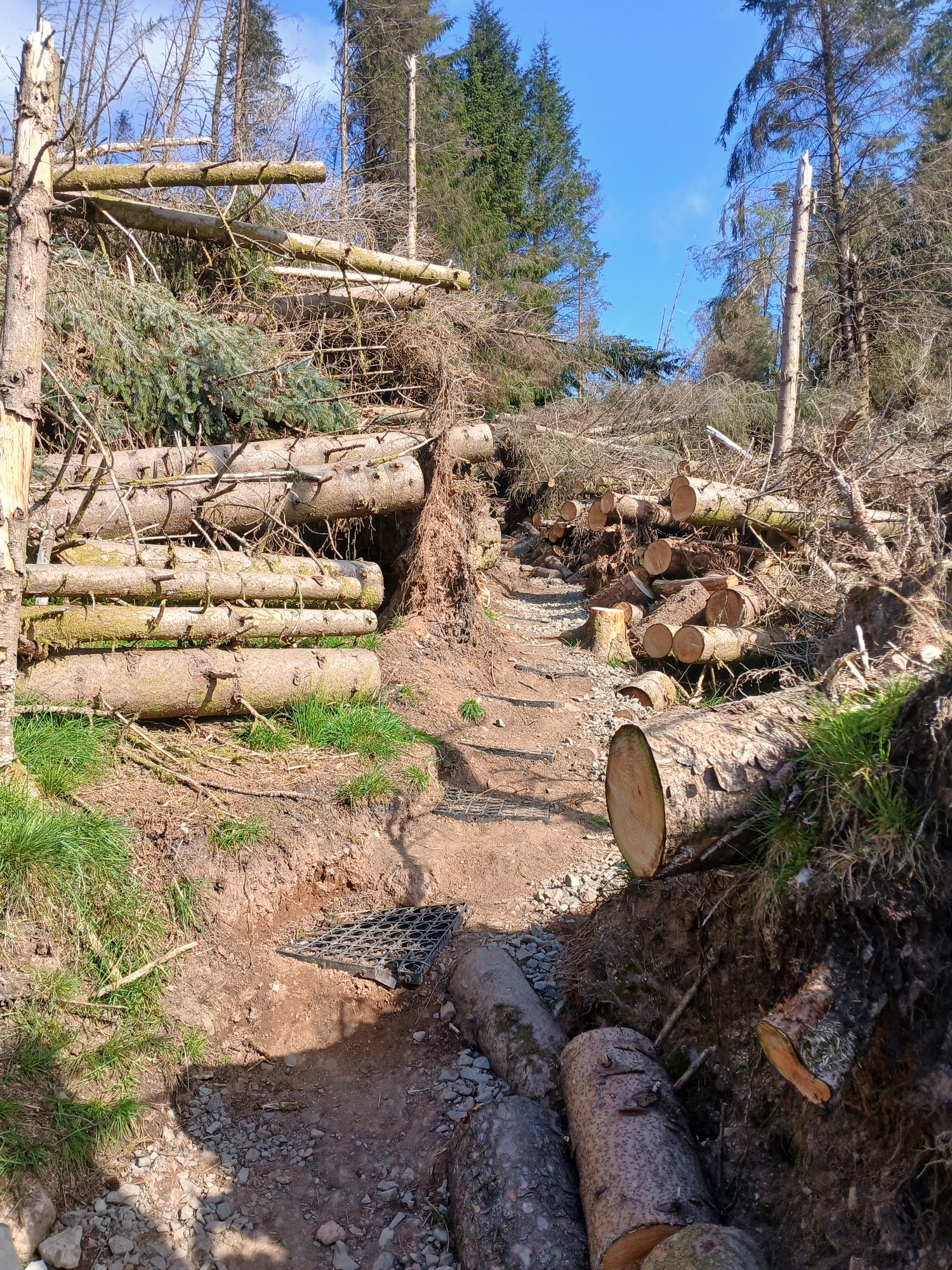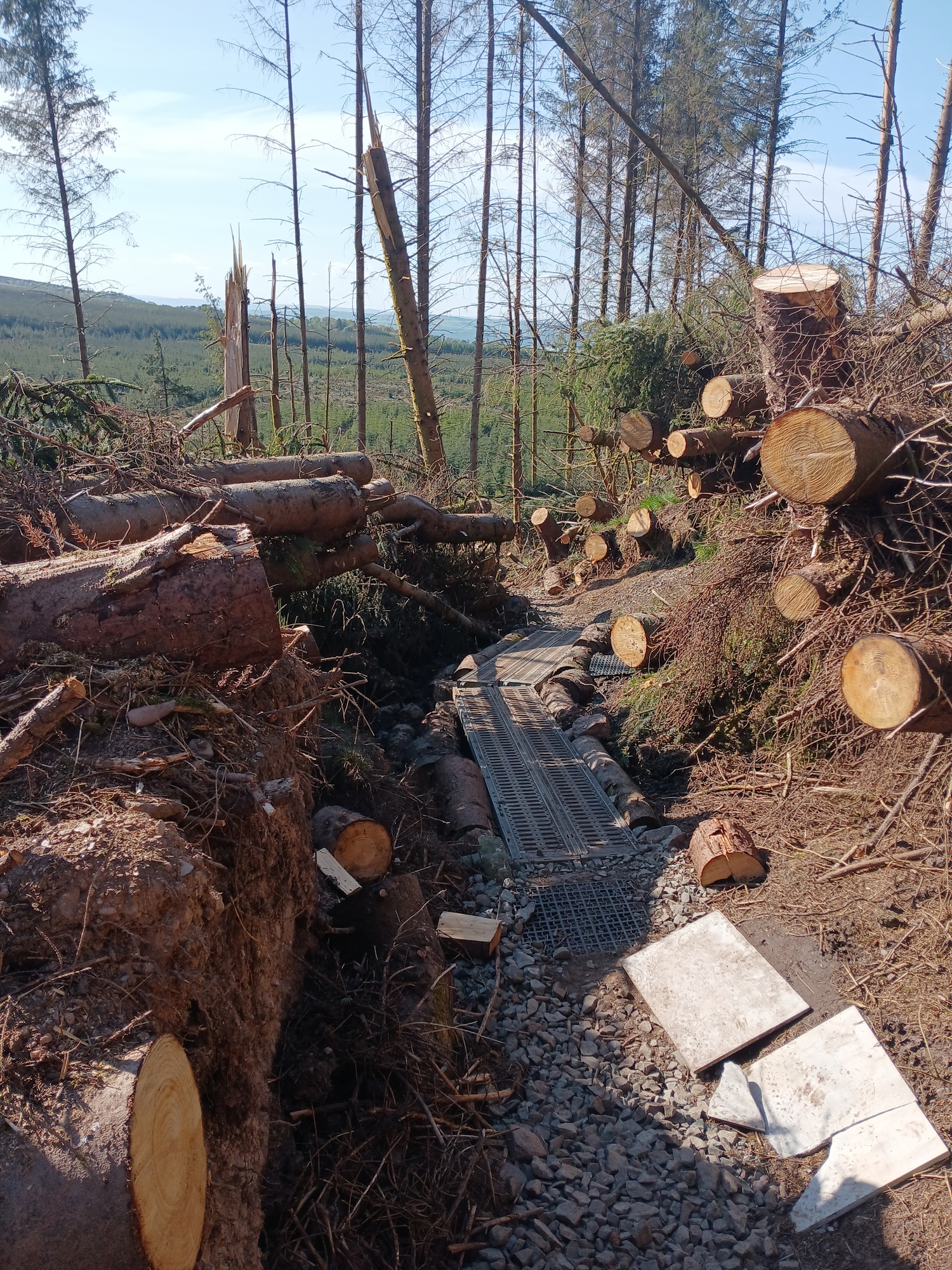 The stony uphill trail continued on from where I'd camped, over the crest of the hill and entered woodland on a well maintained single-track cycle trail with signage at intersections and soon I am heading for a great hill like a wall barring the way without a way around, so soon I'm off pushing. It was lucky the chainsaws had been through as whole rows of trees had been blown down in the big January storm, so I haul the bike up through a corridor of cut tree-trunks. The forestry people were still working on the hilltop where I had to wait briefly while they cut up a small tree across the trail. From the top the way is forest fire road sweeping down to join an A road where I go left, then right upon a narrow single-track road.