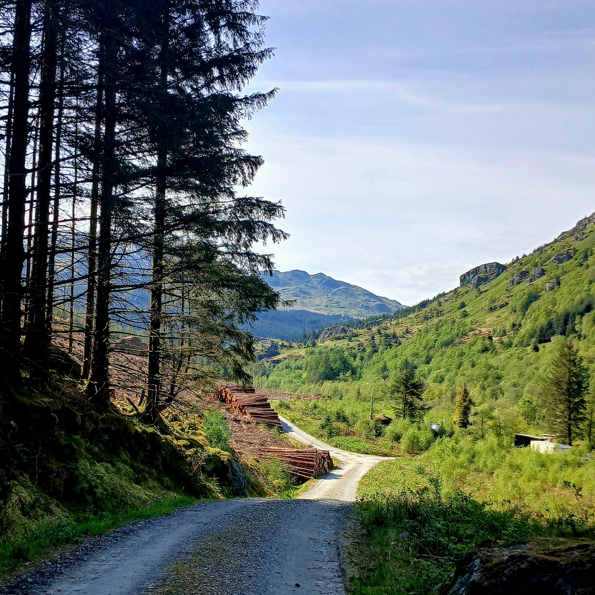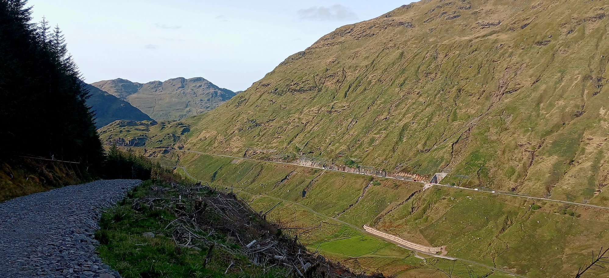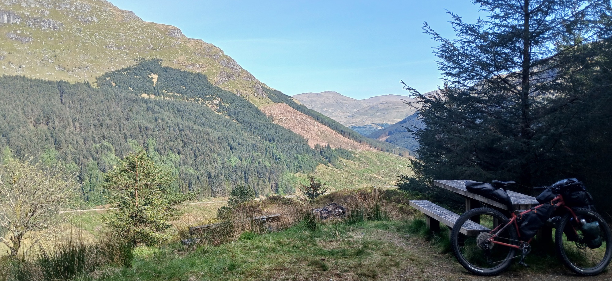 It is a steep climb up from the coast to rejoin the blue Komoot route which I'd deviated off. The way crosses and descends to another loch or sea inlet with steep wooded hills rearing up on the opposite side and follows the coast to a small place no bigger than a dozen houses at the innermost point where, the road turns a corner and returns back along the other side. It is like a Norwegian fjord. The route shadows the metalled road above upon a gravel forestry road, which turns inland up a narrow valley with steep wooded sides, climbing to a great height with a stupendous across at the road carved into the hillside opposite; ante like cars and trucks moving in a straight line. At this point I have stopped at a well placed picnic table and with a fair area of level short sward, it would have made a good campsite if it weren't only 4 o'clock.