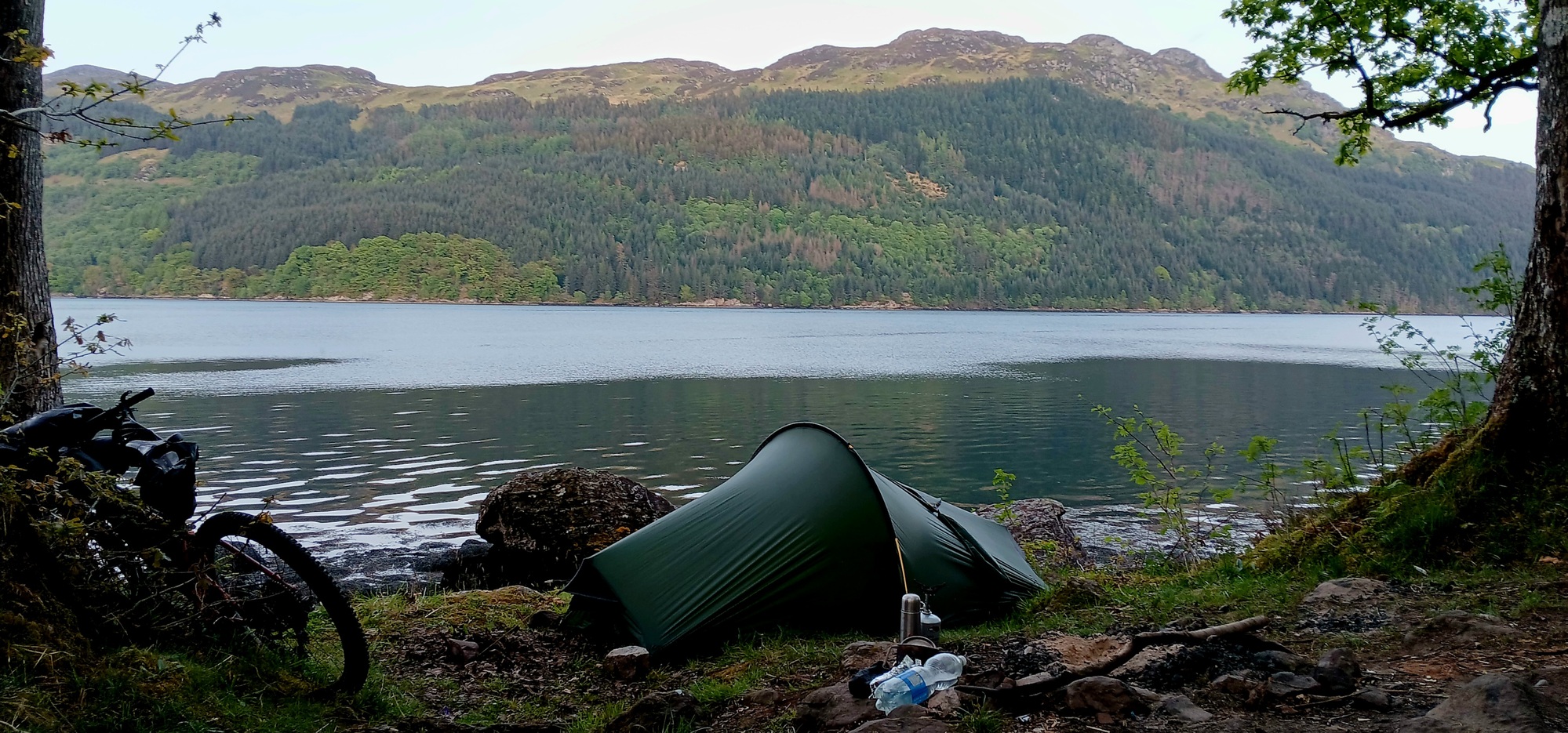 By evening I have descended to Goilhead at the head of another loch-sea inlet and following the coast further come to a regularly used waterside campsite, by the fact there is a stone ring containing blackened ash of a campfire. There isn't much level space but enough for my small tent. I clear the spot and set up.