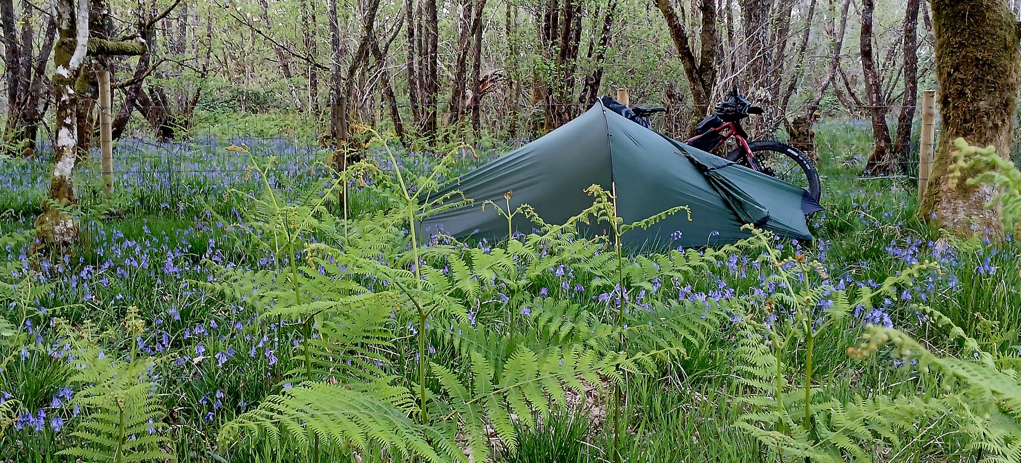 I continue upon the route, turning toward a place called Kilberry and within a mile come to a plot of bluebell woodland along a pasture field into which I ride to a level spot and set up camp.