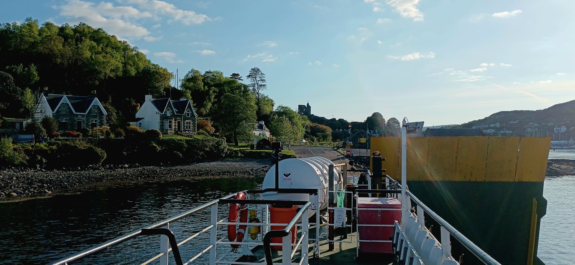 The ferry arrives at 20 past the hour. The friendly ferry woman instructs me to dismount while boarding the ferry and remarks on how big the tyres on the Kona are. There is one other passenger in a Ford hatchback who during the sailing come up the stairs to the viewing deck and sits with a laptop along the bench from where I sat.